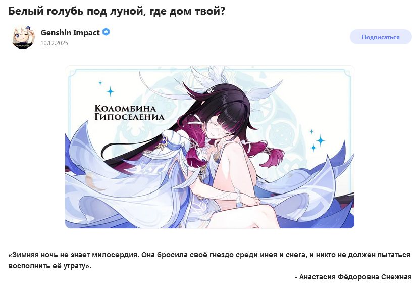 Помню, как я в треде масложопил, что в финальных Новый годах Натлана туда лично приедет Колумбина за гнозисом и нас ждёт квест эпичного сюжета с прогревом на некс регион.