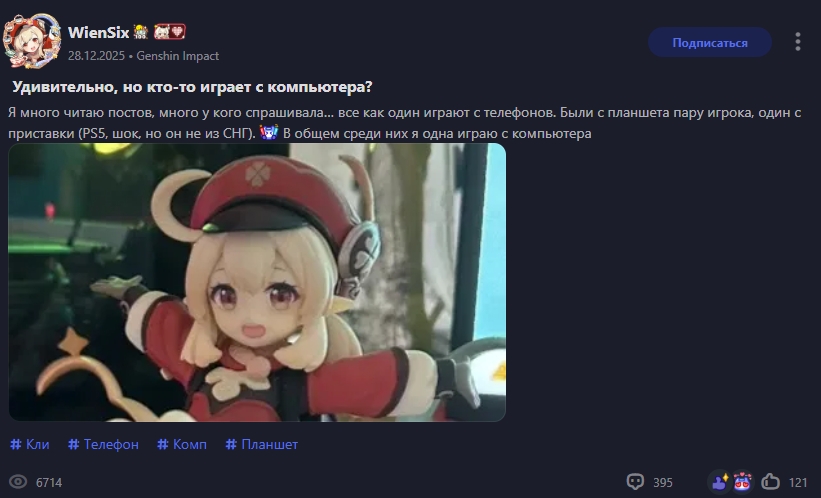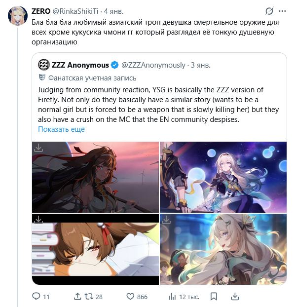 >Да что там с ней не так? Замах был на грозную суровую ебаку, что-то типа Райдэн до конца сюжетки Инадзумы, выхлоп на Коломбину с фестиваля, милую дурашку-очаровашку. Плюс дебильнейший троп девочки-инвалидки-пожалейки. Плюс она слизана с девушки главного сценариста той арки ХСР (буквально сцена в игре скопирована с их личной свиданки на крыше небоскреба с поцеловашками, они выкладывали фотку).