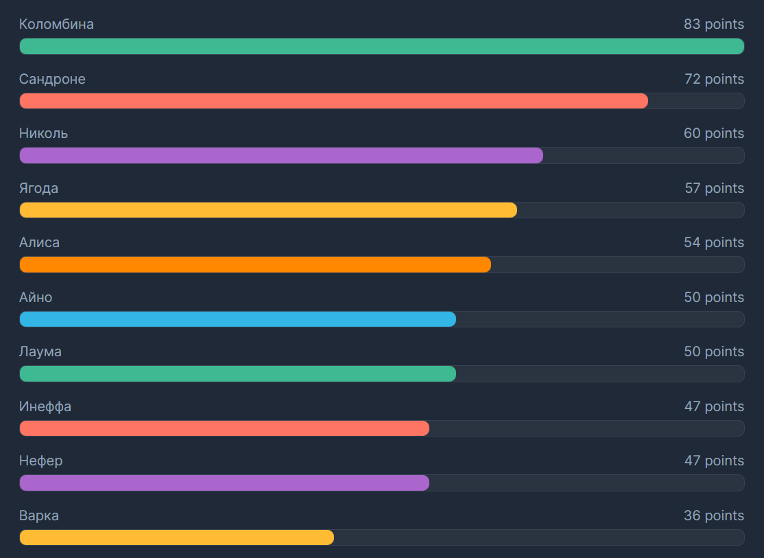 Ты перечислил персов, которых фанаты сами в мемах сливают из-за их посредственности в геймплее или лоре, а теперь ноешь, что их игнорят? Йоимия до сих пор в топе дамагеров по АА, Ноэлль - вечный щитотанк, Чичи в нише хила с зельями, Навия свежая и востребована. "Мемные" они только потому, что вы их так окрестили, а не Mihoyo их скамят. Вarka вообще еще не вышел, так что жди релиза, нытик.