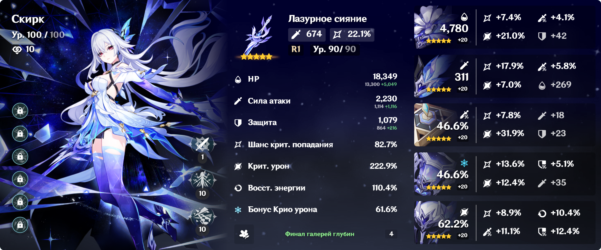 Колумбина: У колумбины +15% крита, у тебя оверкап 10%. Вот стоит оно того - брать бп каталик (да, р5) и с этим пески на речардж? Если у тебя есть каталик на крит урон, то грамотными ротациями + фав на саппортах и можешь обойтись речарджем с сабстатов. А если есть елань (или даже с1) - ещё легче. Скажем, шилонен + елань + колумбина + инеффа, елань на фав и отдаёшь частички колумбине. Тогда ей не нуден речардж, с крит урон каталиком самое то. Билд так себе, но арты недавно вышли, понимаемо.