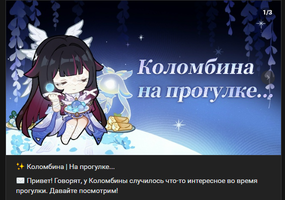 Жесть, оказывается, Колумбину зовут Коломбина, так странно, типа просто в озвучке на англюсике, японском и тд она Колумбина. Может быть одно из тех странных правил перевода, как у Иназумы, которая ИнаДзума или Казуха, который КаДзуха, очень странно звучит.