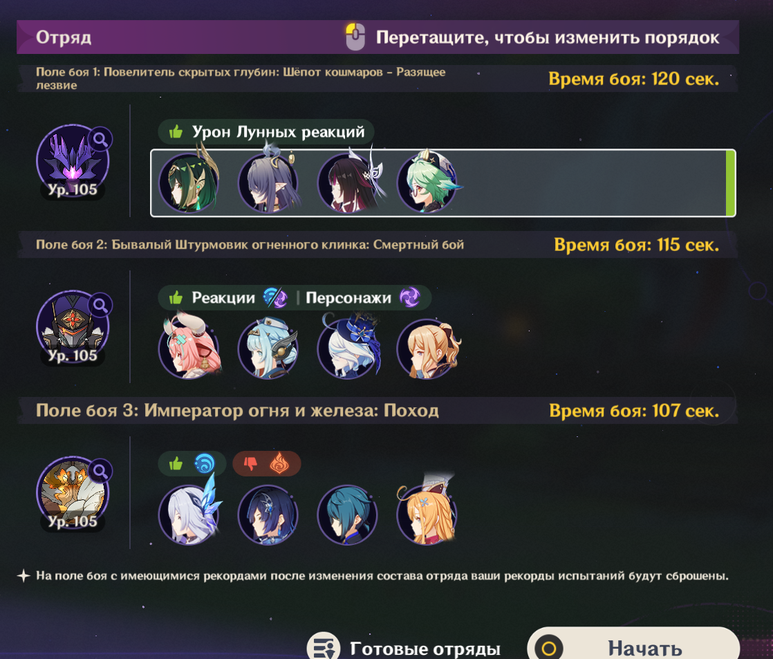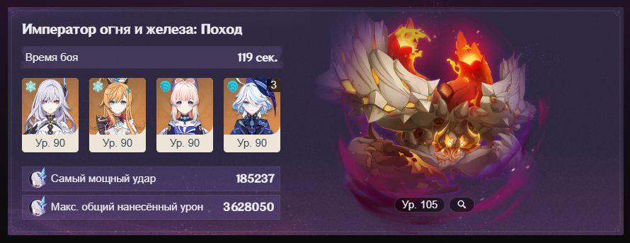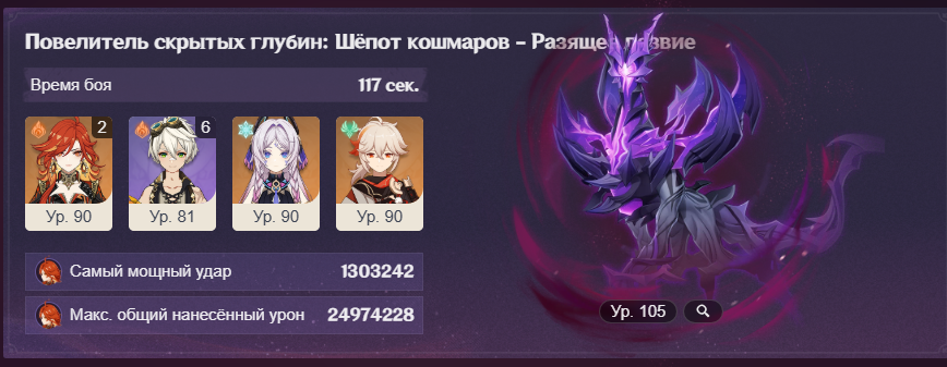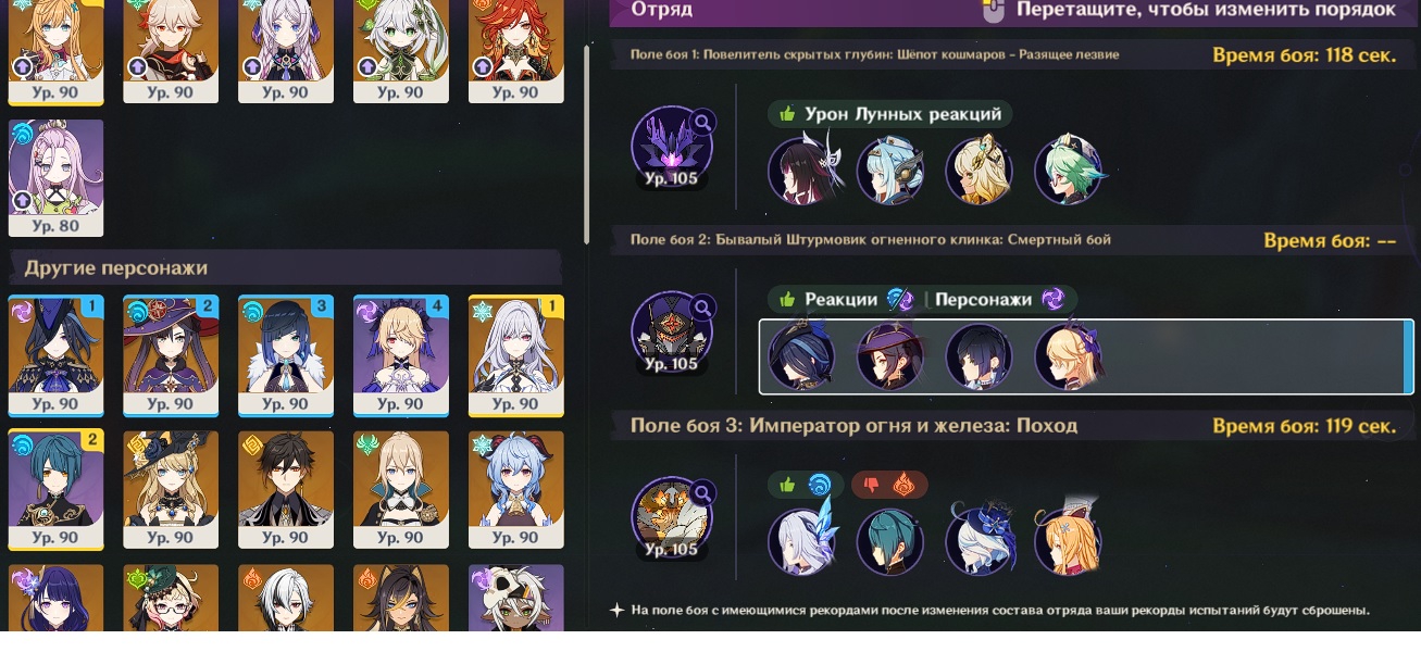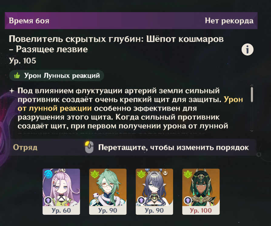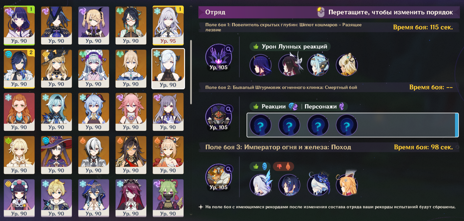Передрочил половину артов на надоеде и попытался выжать максимальный ку, хп и мс с сохранением энергии, сразу был заметен прирост урона на щите, прошёл с первого же трая. Сигны на Шило и Варесе. Нахида с фавонием. Думаю с2 Клумба и Фурина заменяются на сигны у дд и пройти можно будет с такими артами на всех.