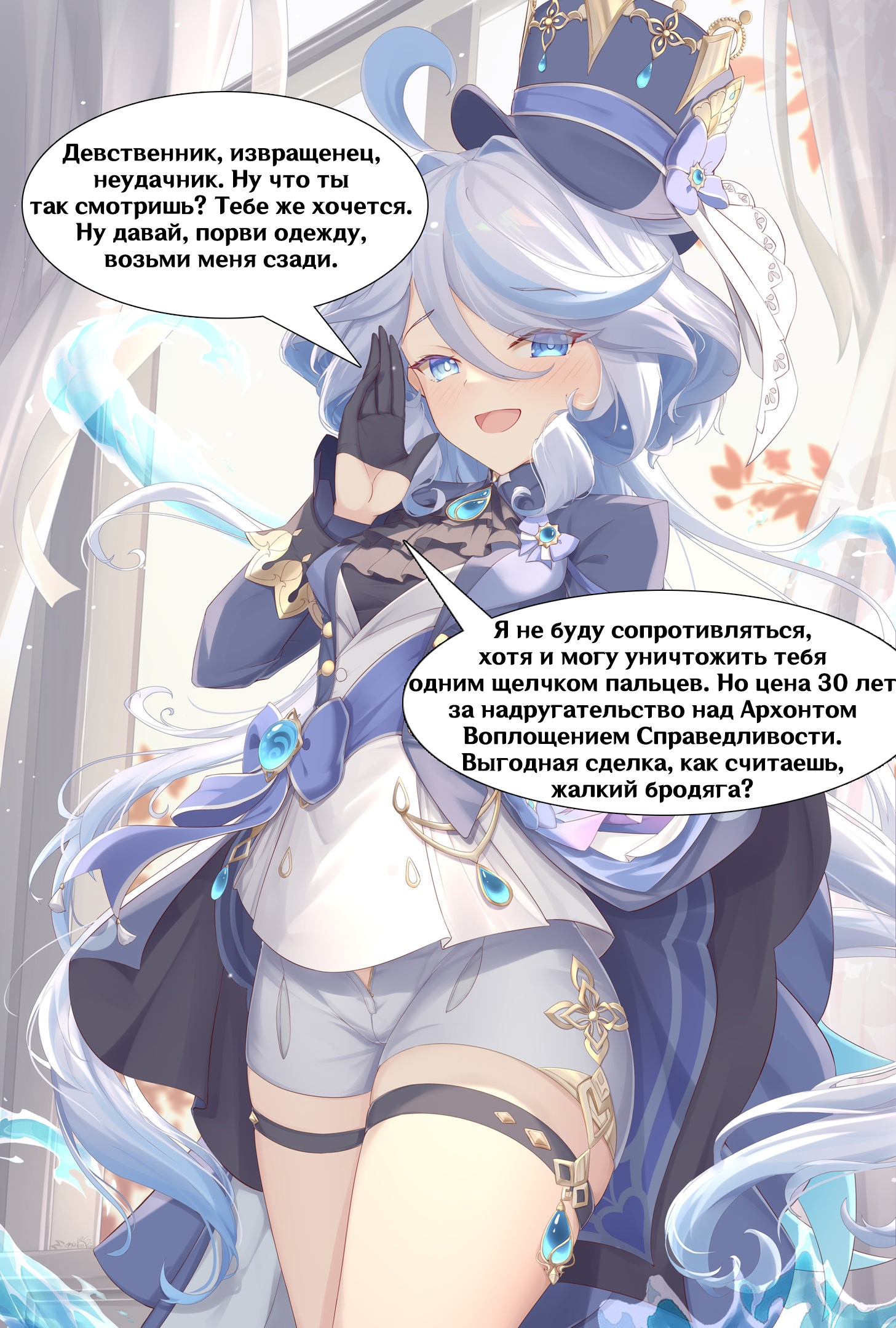 Я фишль, принцесса осуждения, хозяйка нирванны ночи! Моим левым глазом, глазом правосудия, я вижу нити судьбы этого мира, а уста мои глаголят истину скрытую под покровом бескрайней ночи. Но правда эта опасна, и может свести с ума не посвященный разум! А оттого воистину недальновидно с моей стороны, было бы расскрывать ее слишком часто. Озз:"Ты можешь стать этим аноном, а я ебал таким слогом на постоянке писать, действительно шизануться можно"