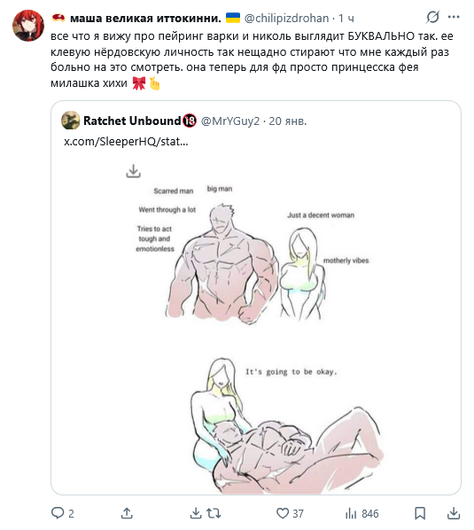 >>6261517 Чурлам как бы за 500 лет, и те кто к Светке не пошёл - кукухой поехали. Они же проклятые, и не по своему желанию так выглядят. Это как бы куча спидораков от которого ты отъехать должен, но ебанутая "богиня смерти" не даёт подохнуть, и вот ты кукухой едешь от всего. > когда чурл оказался няшной тяночкой Была когда-то, общался он не с чурлихой в которую та тян выродилась (чурла сбежала роняя ключи от корабля), а с памятью. > их надо вырезать на корню Так вроде они не могут умереть. Капитано натурально чурл, потому и таскает маску. Там сохранился только Данслейф, даже вон, Рерину хлебало покромсало. Все кто за Светкой ходит тоже в масках, так или иначе.