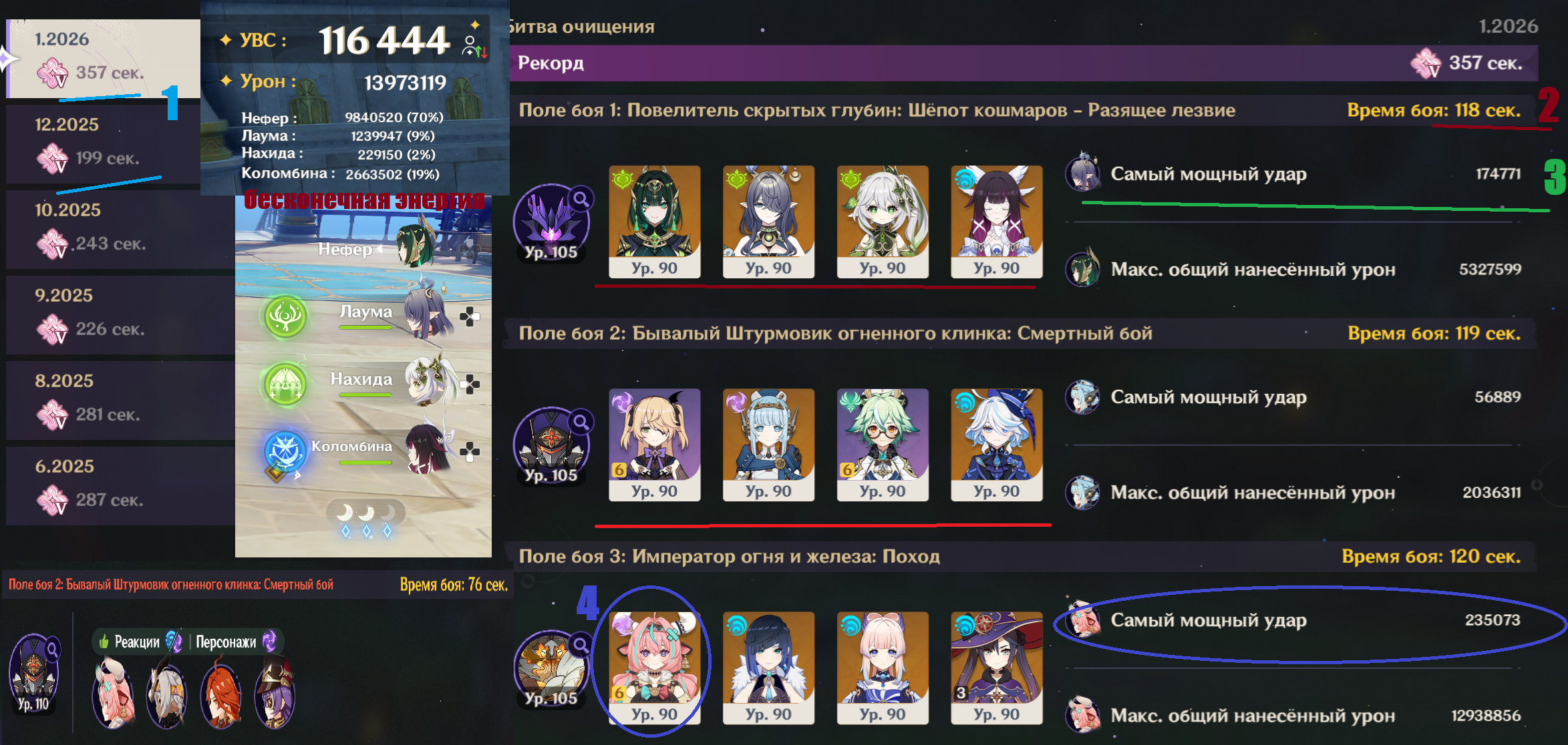2. Сигнатурная (!) пачка Нефер с 4 лимитками (!!) едва-едва в таймер уложила коня. Я прикрепил цифры из дпс-манекена на натиск 105 (с бесконечной энергией, на собаке её норм рефилят) - то есть пусть даже не 115к, а 90к, допустим - это всё равно больше, чем у любой другой моей пачки, кроме Варесы. Даже Скирк максимум 85к выжимает. Ну и это всё на фоне Рассольника, где пачка в 2 косты (ни одного лимитного оружия) заебашила босса. Айно, кстати, не вытянула, хотя очень старалась, там 5% оставалось.