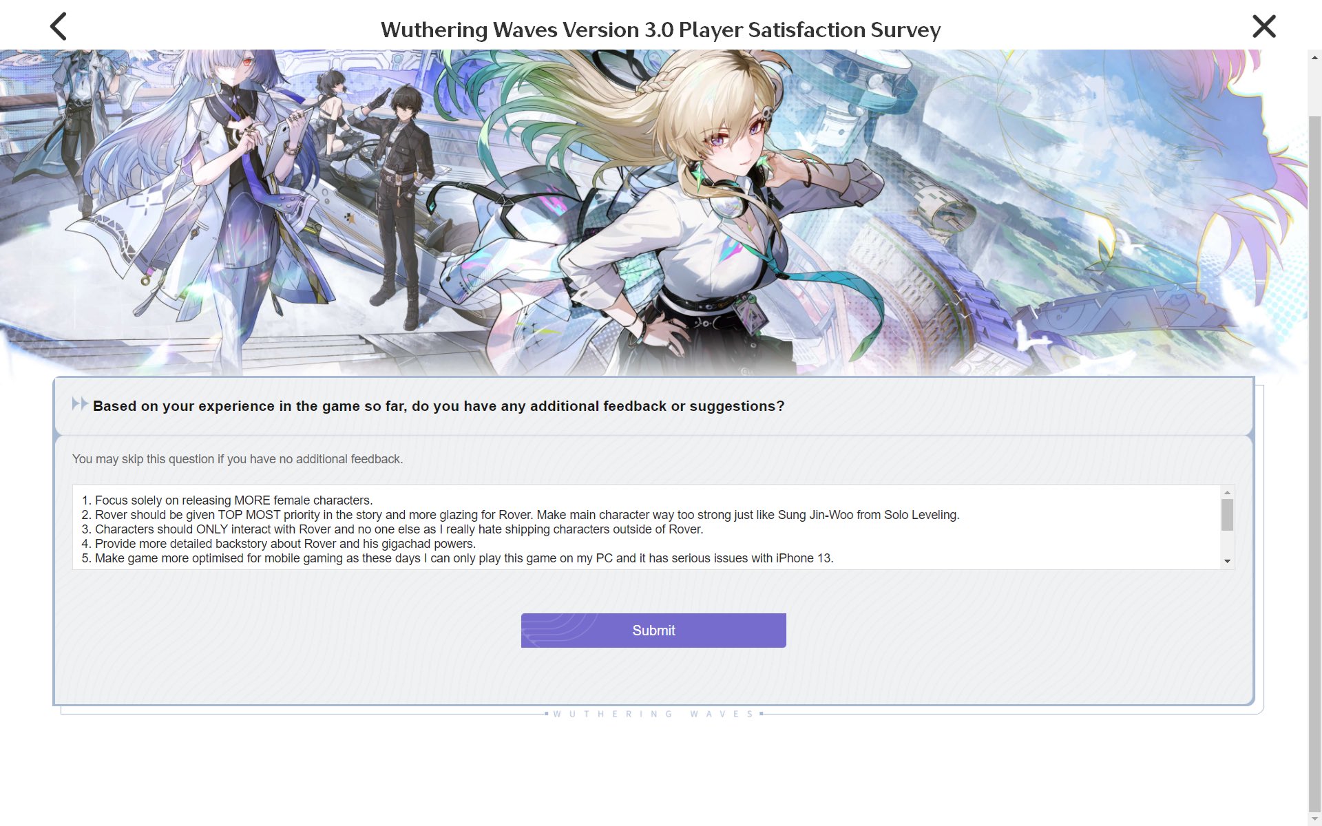 Причем на релизе вувы, сами же геншинята приходили и кривили нос говоря, нахуй вува геншин скопировала - зачем нам второй геншин. И самый прикол что на бете они же критиковали вуву, что делает там что-то свое какое-то серое и невзрачное, нахуй удаляйте и делайте геншин. Им сделали геншин, они морду скривили и ушли. В итоге Куро переориентировались на тех кто остался, начали пилить синему и вот на хайпе геншинята врываются в 2.х и видят, что куро опять не геншин делают. Это какая-то странная логика у них.
