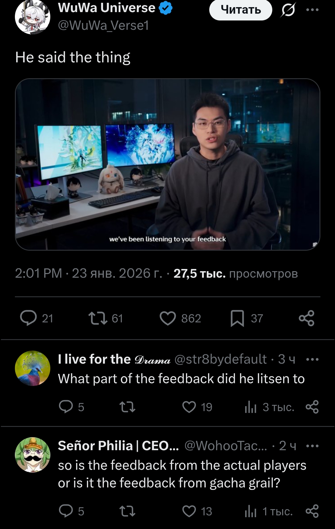 но есть нытьё по гаче, pity не растут быстро, счётчик круток напоминает что бабло сосут, промки все активировали но жалуются что мало. прошлый тред был тише, этот оживили на пару сотен постов.