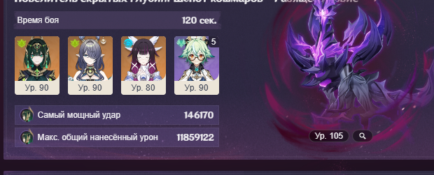 С крафтом и без конст вот такой результат. Но мне в артах конкретно на Нефер дохуя критшанса навалило, и урон пока выше этого разогнать не выходит. Надо минимум 200 крит.урона, чтобы позоричные 120 сек превратить в 110