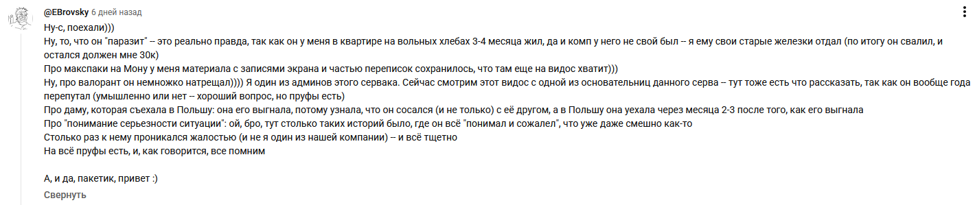 >>6301014 Комментарии почитал и слегка расстроился. Паренёк, судя по всему, живёт красиво - у кучи людей долгов назанимал, жил по квартирам чужих людей, ел и пил за их счёт, у кого-то партнёра отобрал.