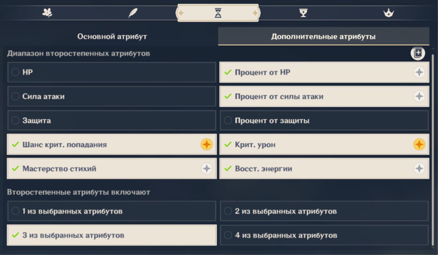 - 3 из выбранных атрибутов - Шанс крит. попадания - обязателен - Крит. урон - обязателен - остальное по вкусу