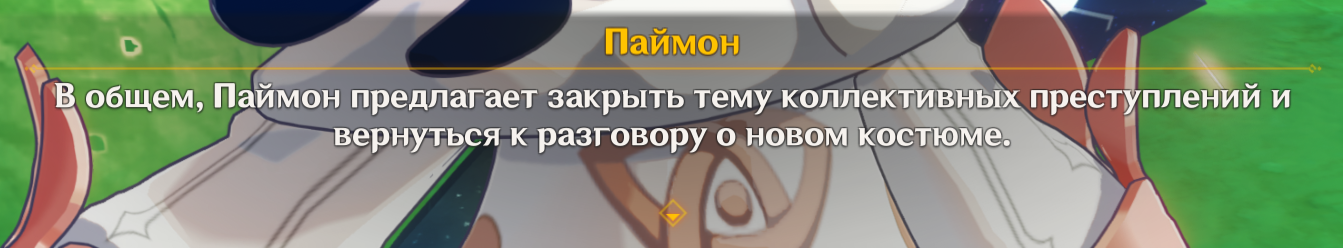 Ну пожалуйста, ну прости меня! Паймон не хотела портить тебе праздник. Паймон только хотела, чтобы было весело, чтобы все смеялись. Прошу, не бросай Паймон одну. Я что угодно сделаю, только...