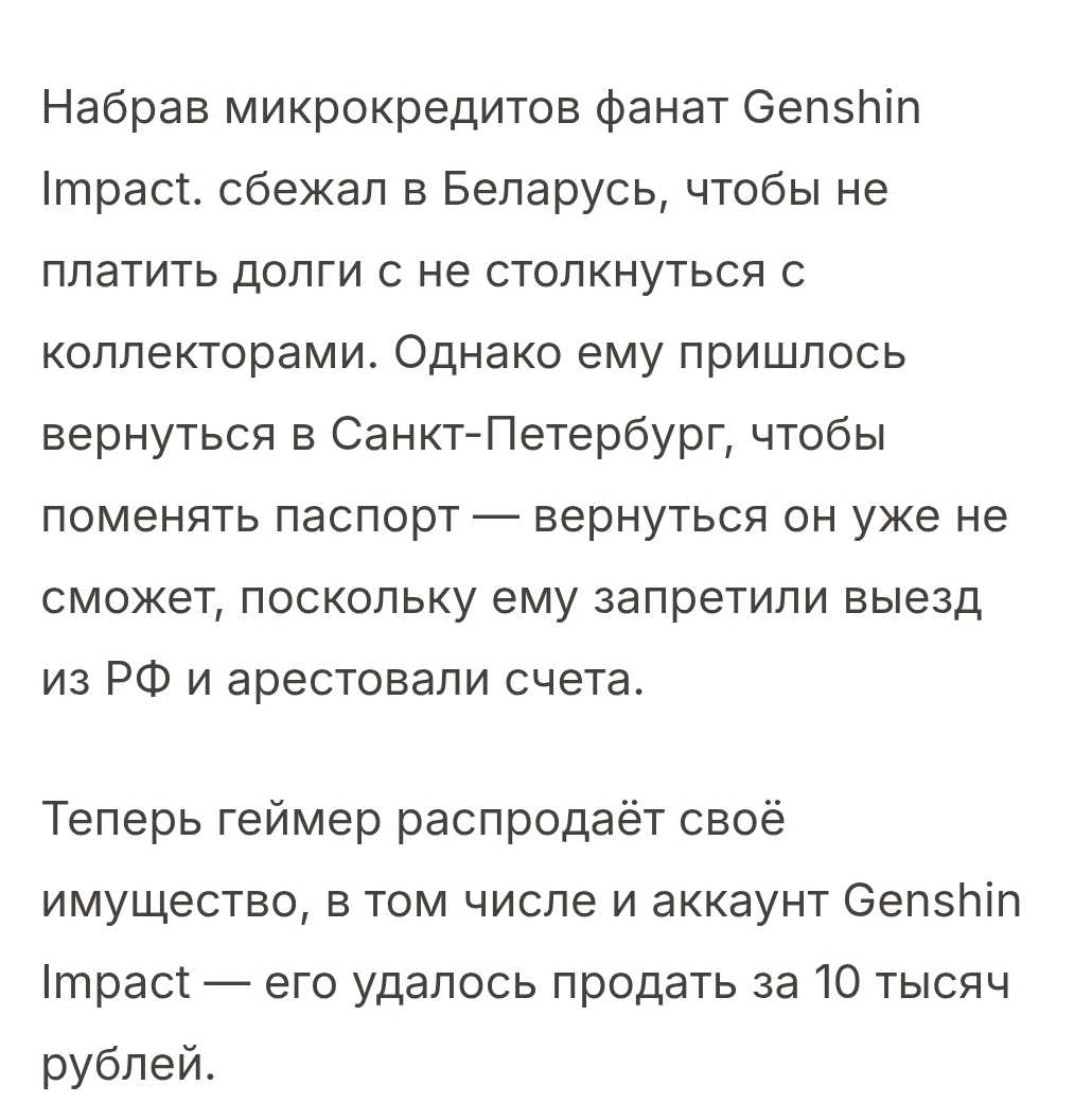 Питерский геймер набрал микрокредитов на полмиллиона рублей ради покупки персонажей в аниме-игре Genshin Impact. Прокачанный аккаунт он продал за 10к, чтобы закрыть долги