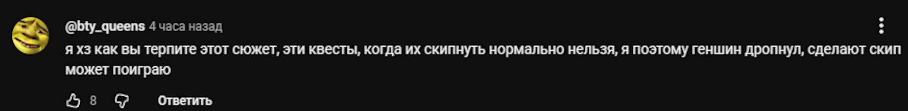 В итоге средний игрок немного привередливее становится, уже много слопа видел, и при этом внимание другое, делает выводы по первым секундам. Планирует во что-то сыграть, видит - шрифты Arial и худ из прямоугольников, думает "если они даже над кнопками не постарались, явно же остальная игра хуйня", и вычёркивает проект из желаемых. Театр с вешалки начинается, типа.