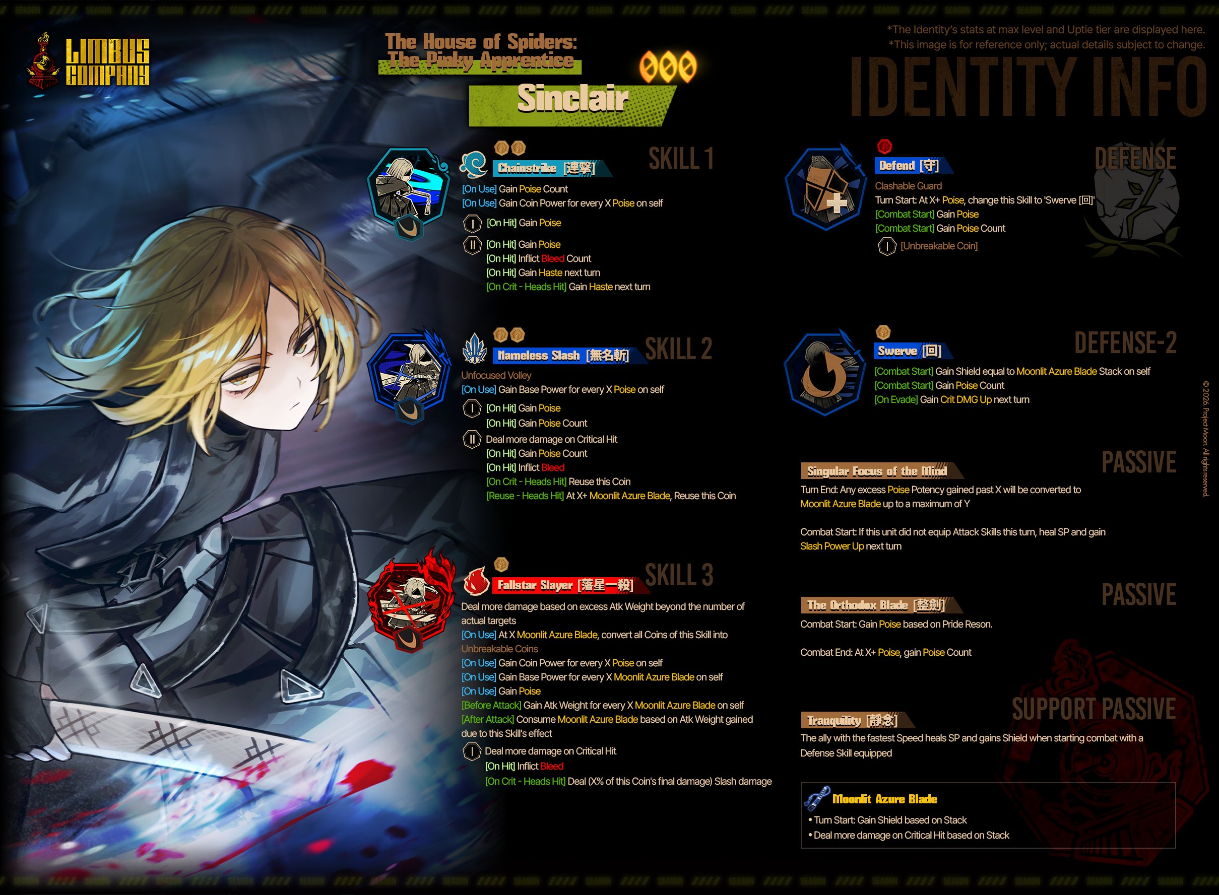 Пойз "чардж" ид, которая не накладывает синкинга и регенит СП при ударе по правильным целям помеченными скиллами. Насрано множеством микро баффов на скорость, оффенс лвл, дмж ап, пойз потенси/каунт и синкинг, которые принципиально ничего не меняют и собираются практически сами собой. 1 раз игнорит стаггер.
