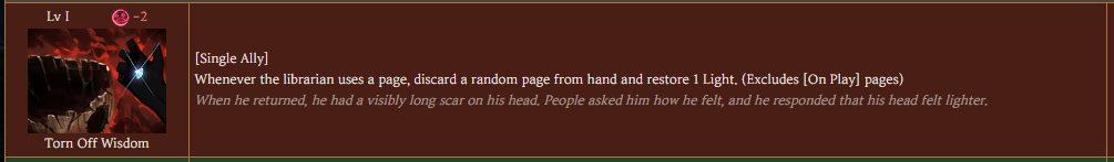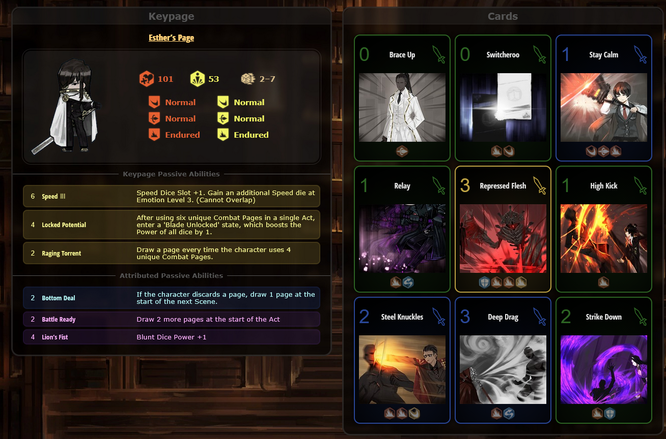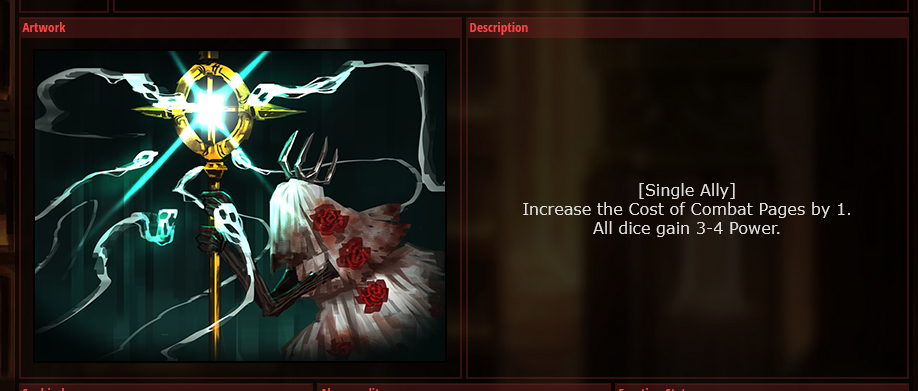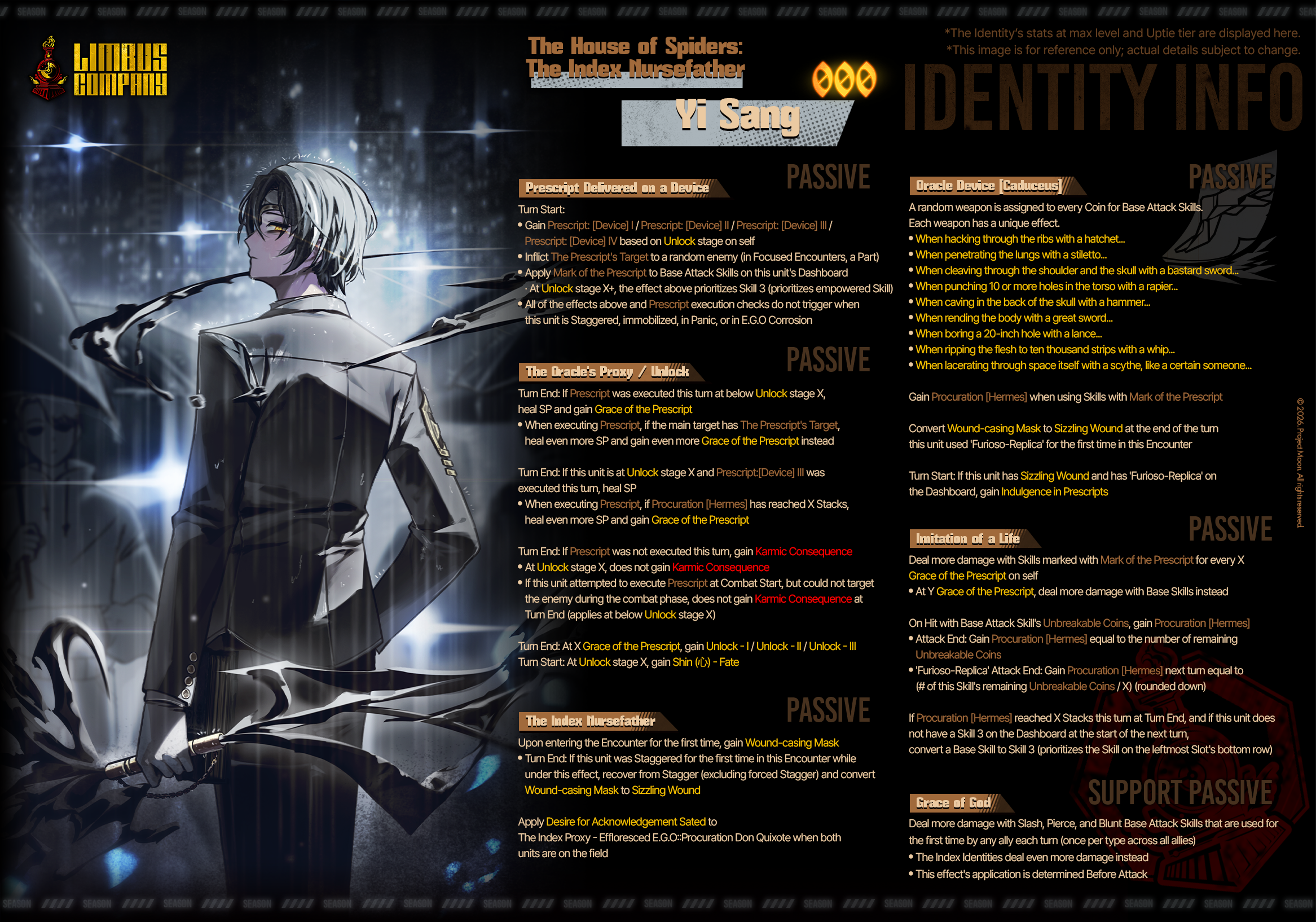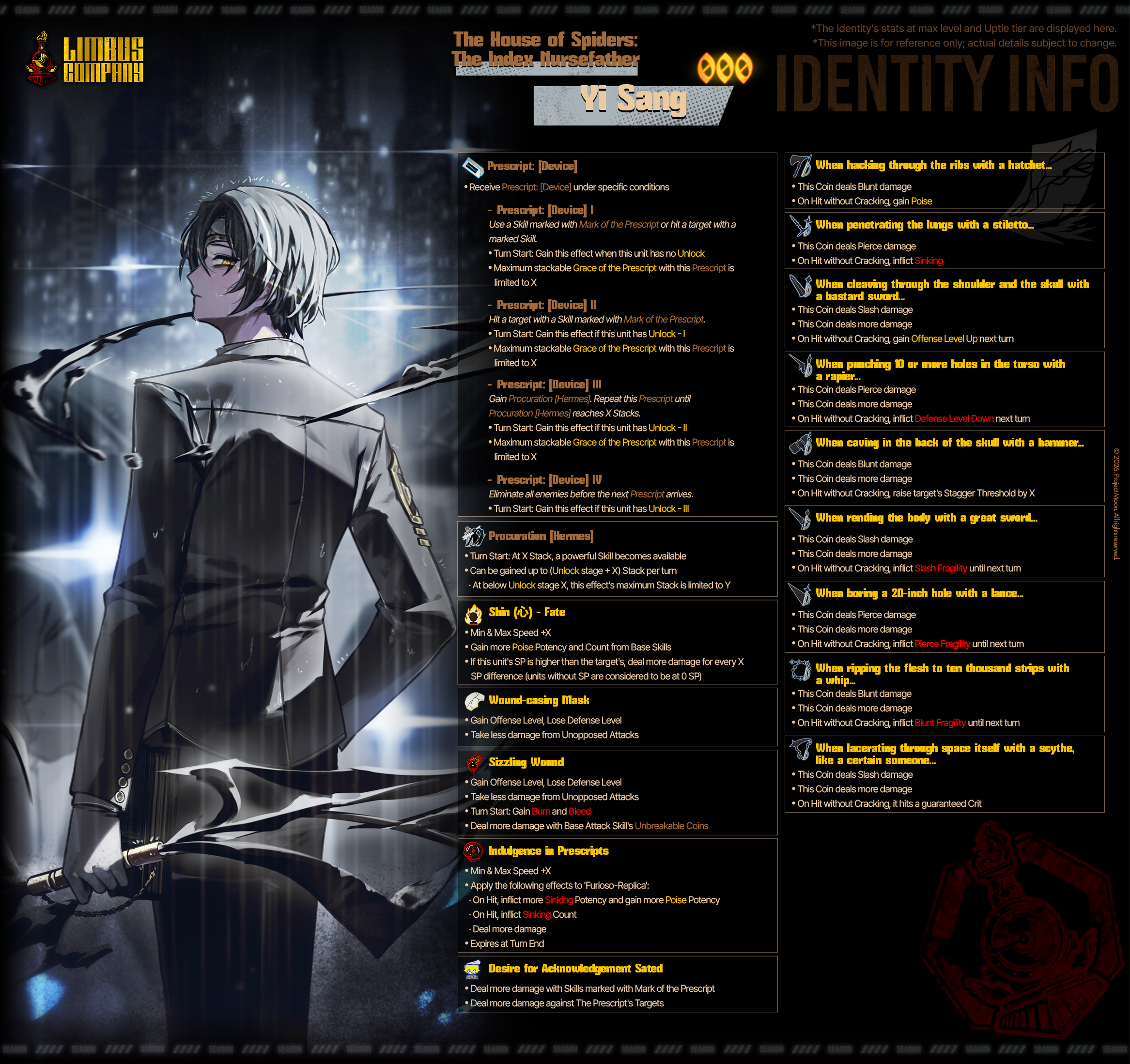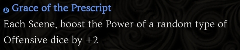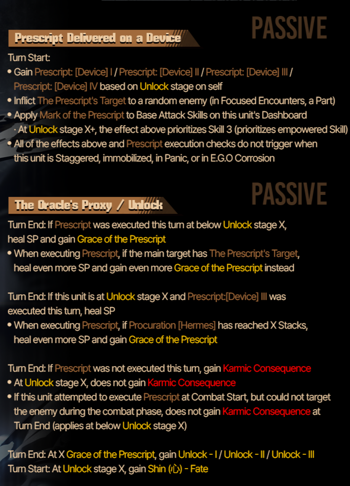 Passive Grace of the prescript You cannot see the types of the upcoming skills of the Index identities. Upper row skills are marked by the Grace of the prescript. Marked skills are converted to the damage type of the Grace of the prescript and gain +2 Coin Power. EGO skills that match the damage type of the marked skill above gain Final power (10 - number of coins x 2) and Coin Power (number of coins/2) (rounded down) (max 2).