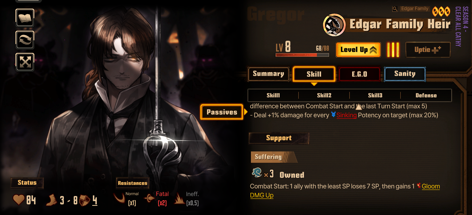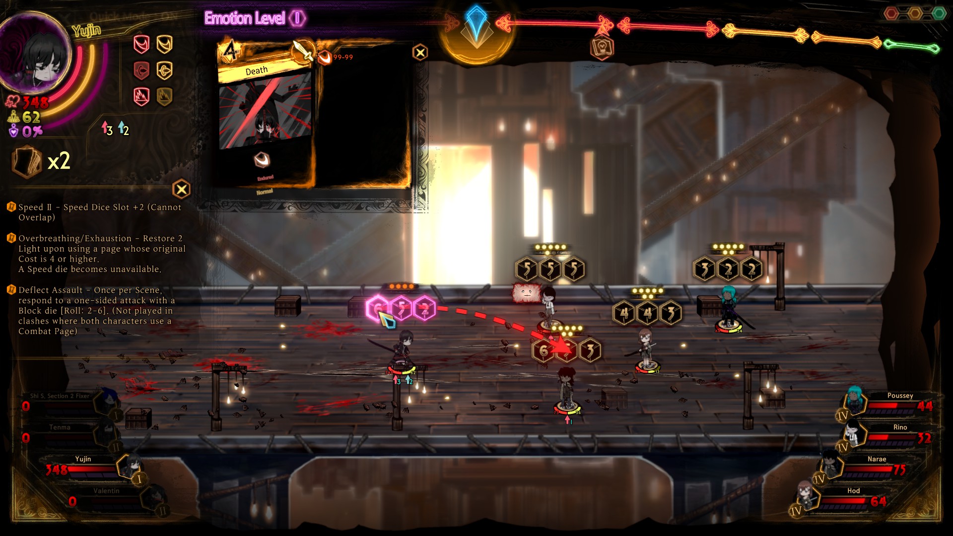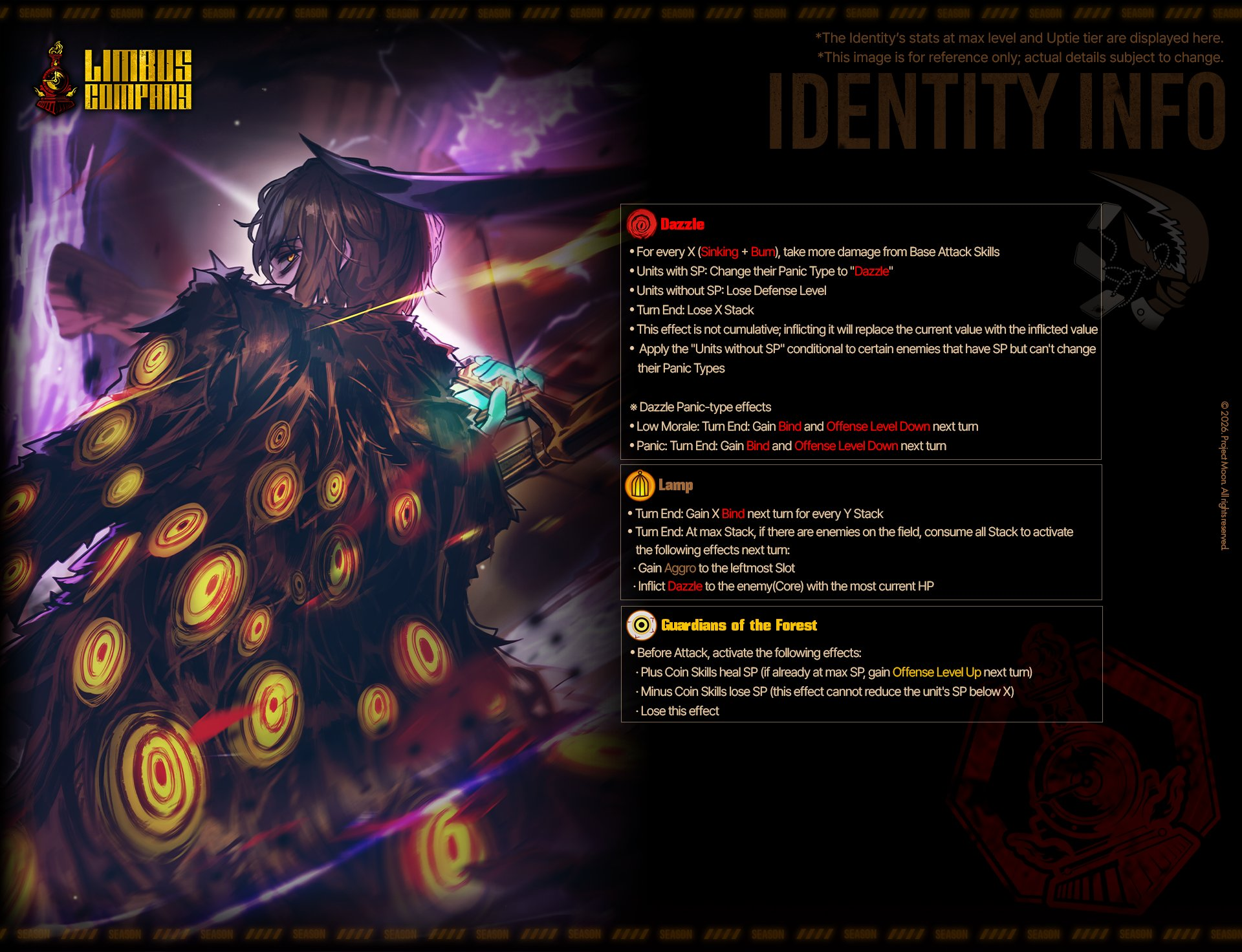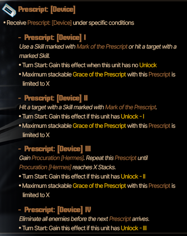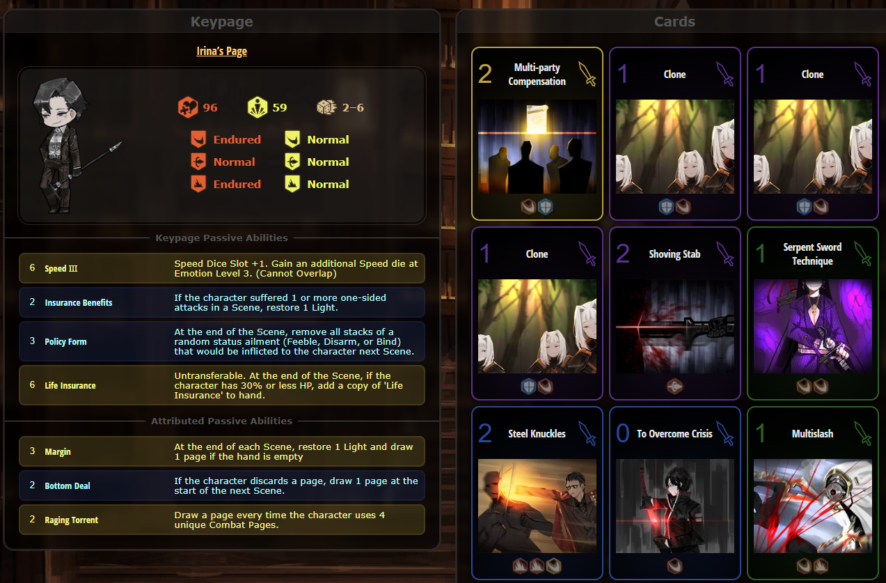 Passive Grace of the prescript You cannot see the types of the upcoming skills of the Index identities. Upper row skills are marked by the Grace of the prescript. Marked skills are converted to the damage type of the Grace of the prescript and gain +2 Coin Power. EGO skills that match the damage type of the marked skill above gain Final power (10 - number of coins x 2) and Coin Power (number of coins/2) (rounded down) (max 2).