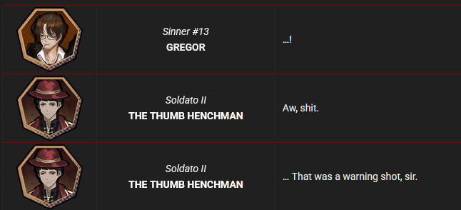 Сам то вдумайся. Если убирать условную геймплейную форму ограничения на 7 грешников на файт - 12 почти бессмертных типов с возможностью надевать на себя личности различных войнов, абнормалий, дристортиться различными эго, включая даже тех, кто уже давно умер, еле вывозят файт против одного человека пусть будет Лей Хенг, например , ну и чё, скоро там экстерминатус ?