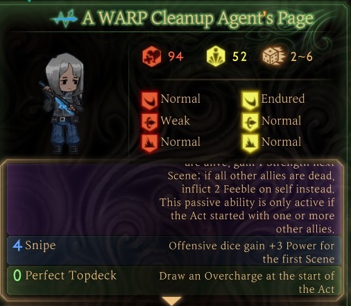 >>6415600 Во первых, фулл дискард залупа. Слишком дохуя карт уходит в дискардовый движок, а на выходе имеем то, что библиотекарь может по сути использовать только одну хорошую карту в ход ради...? Ради двадцать с чем-то хп в ход. На грани неиграбельности, но терпимо если это малозначимая затычка на этаж. Во вторых, легендарные максслотовые персонажи как Ирина не могут эффективно использовать тяжёлые 3+ световые карты. В рамках их экономики это обычно значит, что остальные карты будут односветовые или меньше, тем более на максимальном уровне эмоций, где генерация света тупо уничтожается внулину. Ну и конечно, не имеет смысла проговаривать вслух, что играть односветовыми картами практически невозможно. В третьих, карта на генерацию света союзникам - эксклюзивна Ирине И является легендаркой. Т.е., в идеале, мы бы хотели бы оптимизировать эту фишку, но ввиду выше перечисленных пунктов в этом билде нету колодо-механического пространства под это, ТЕМ БОЛЕЕ, через такую залупу как сингл поинт стаб.