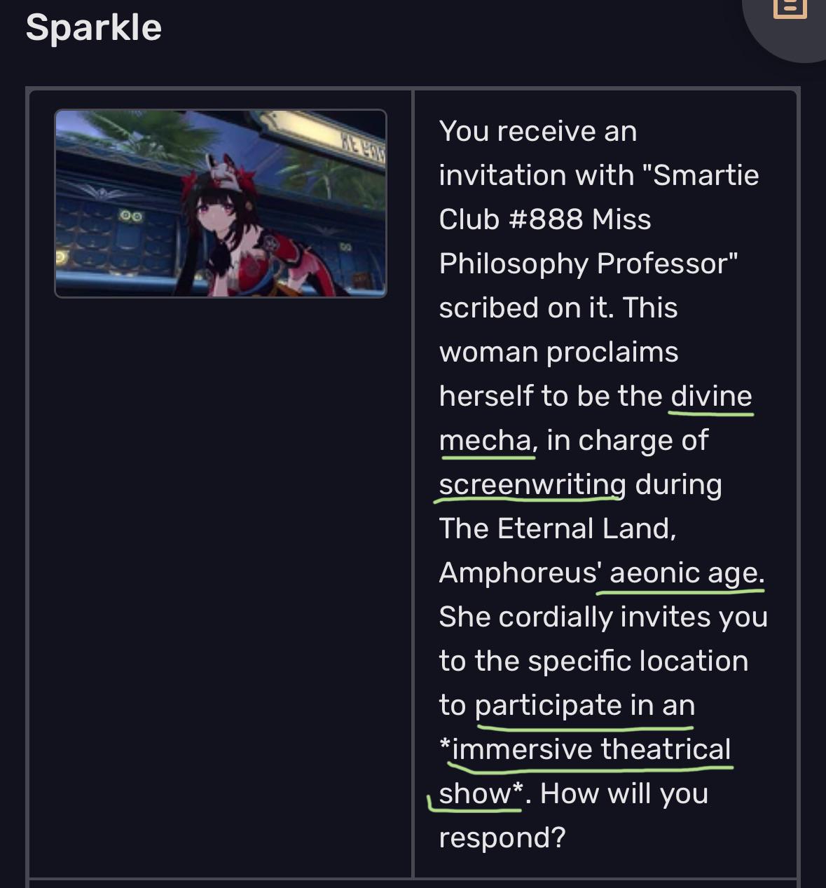 >>6314781 Шаоджи успело посетить пару новых идеек, всё же не до конца раскрыто, в чём романтичность романтичной истории, да и про пещеру опять же. Так что 4.0 начнется с небольшого (на пару часов, ну максимум на три) реткончика про Амфореус. Ликург пояснит нам, что не всё, что мы видели, было тем, чем казалось, а на самом-то деле ух!