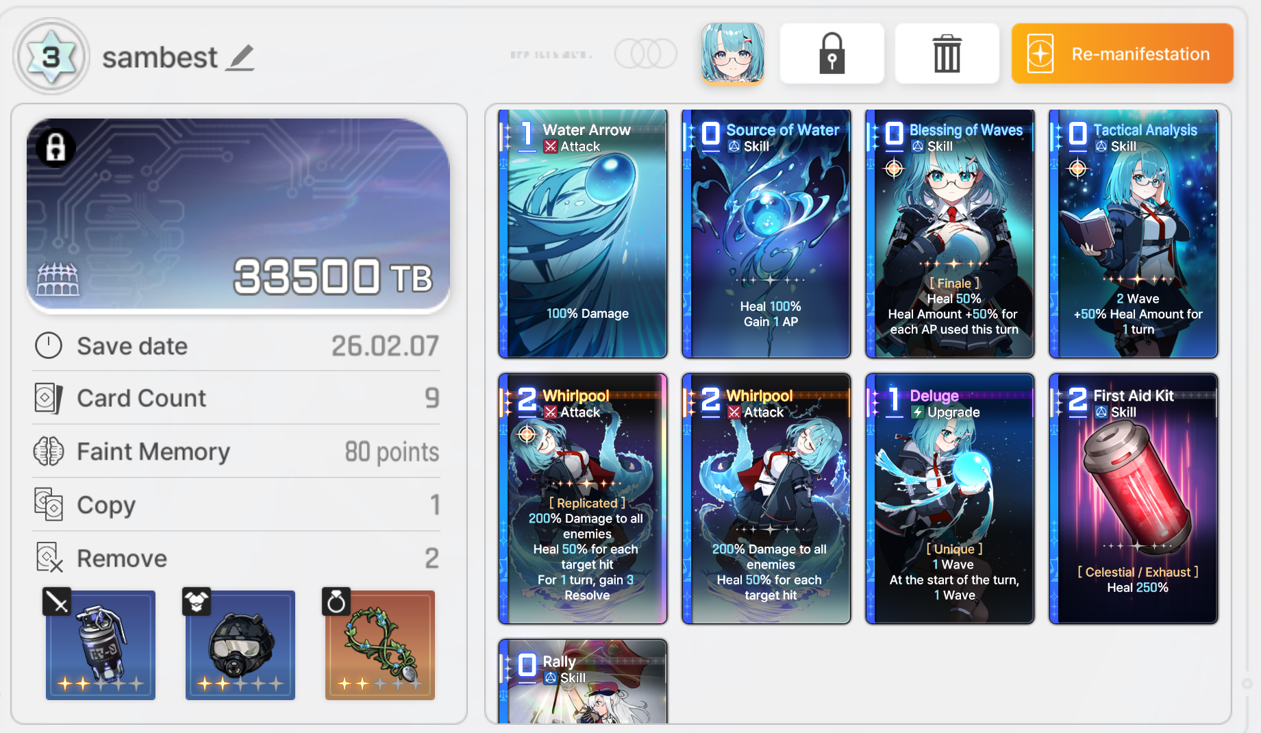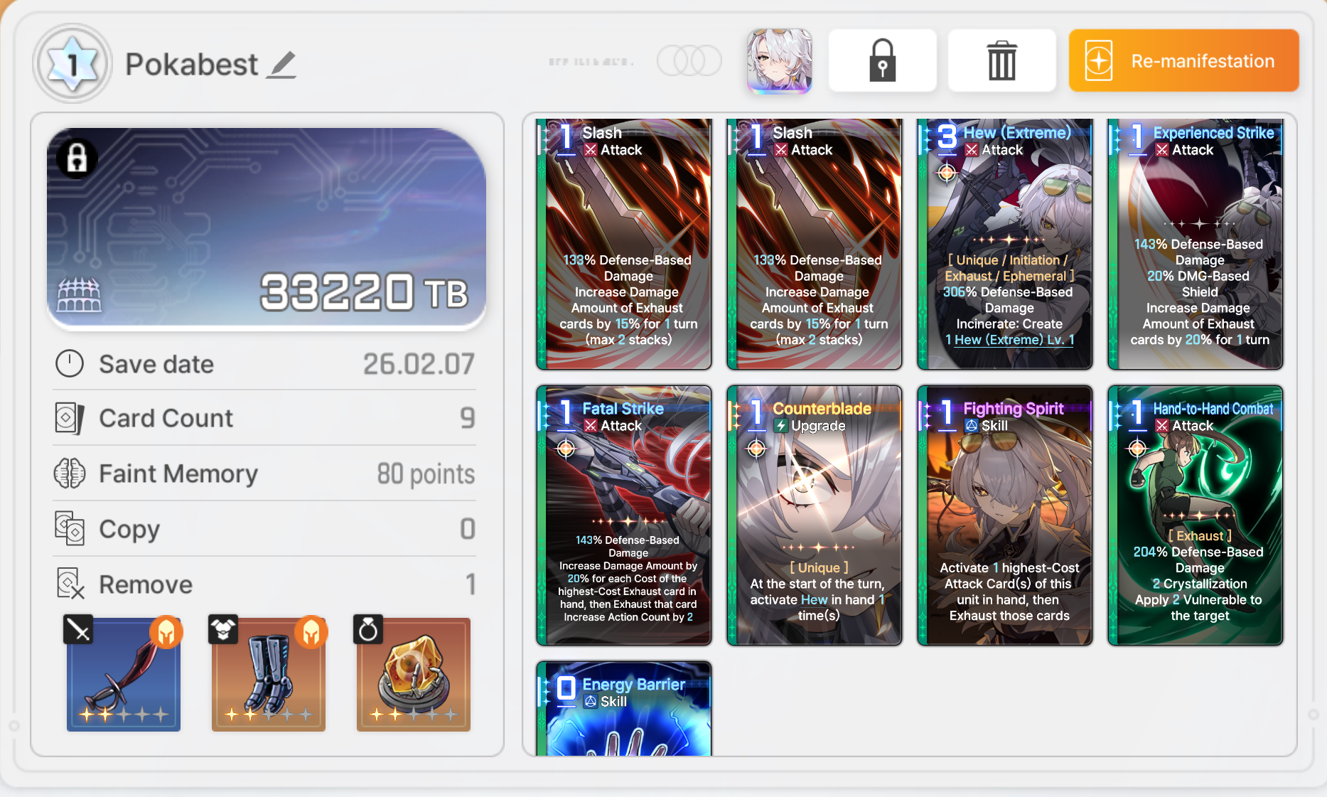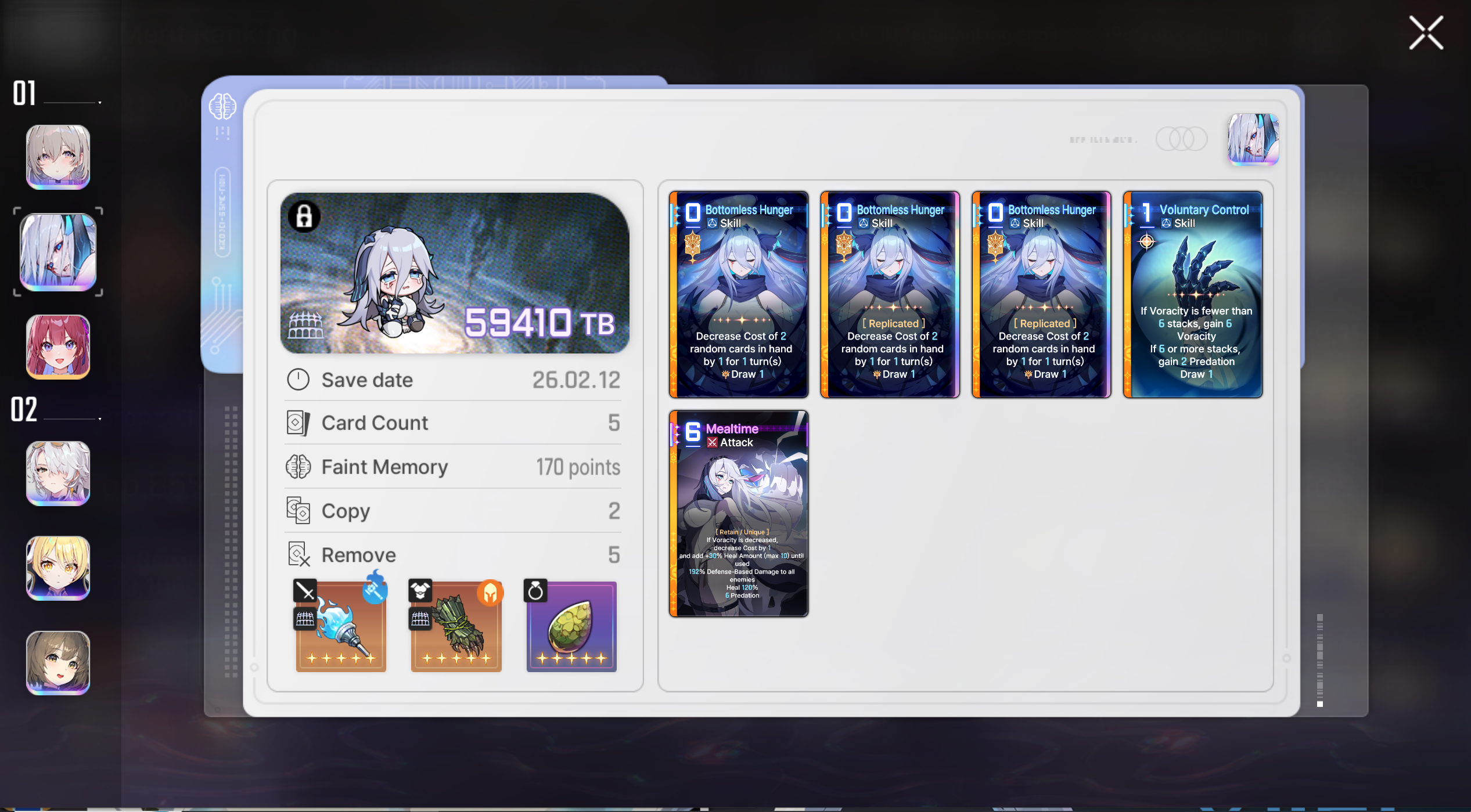 >>6383136 В хаосе открываешь статы персов, там будет написана текущая стоимость колоды, например 120/140. Сейчас первые две копии стоят 0, удаления базы стоят по 20, удаления остального 0. Поэтому все достаточно просто.