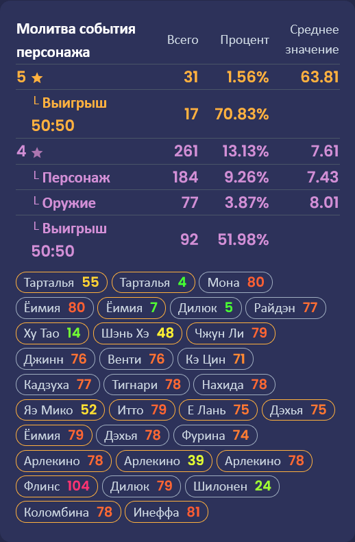 >>6329789 Посос может случиться не обязательно в геншине. У меня на одном акке геншин и зыза, в геншине нормальная статистика, последние два 50/50 я выиграл, а в зызе полное очко, 11 из 13 коинфлипов я проебал, и при этом персы мне падали на 75+ крутке.