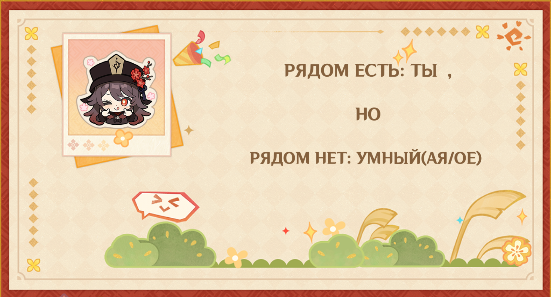 >>6353441 В прошлом году Ляо дал возможность лепить стикеры сами, стикеры самые обычные вроде смайликов из чата и всяких цветков сахарков. Ироки из этого умудрились клепать открытки вроде где Паймон летит на самолёта к башням близщнецам лол. А теперь представь что будет если игрокам дать возможность самим писать поздравления. У ляо за это отнимуть всех кошко-жен и весь миска рис, поэтому только одобренные фразы.