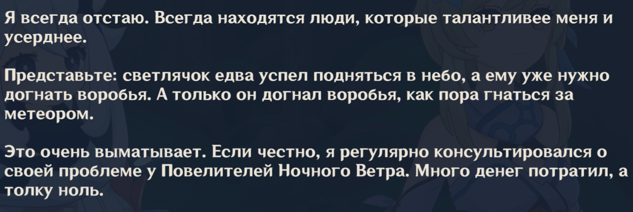 >>6354305 Помню его больше, чем всех нпс вышедших после второй половины сумеру. Все потому что я еще не догадывался какой слопер на сценаристе, жирный сяо, и был терпелив. Но мне кажется даж тогда мало кто читал этот квест.