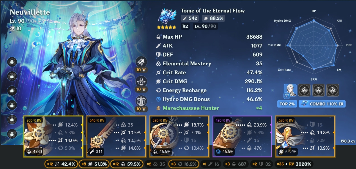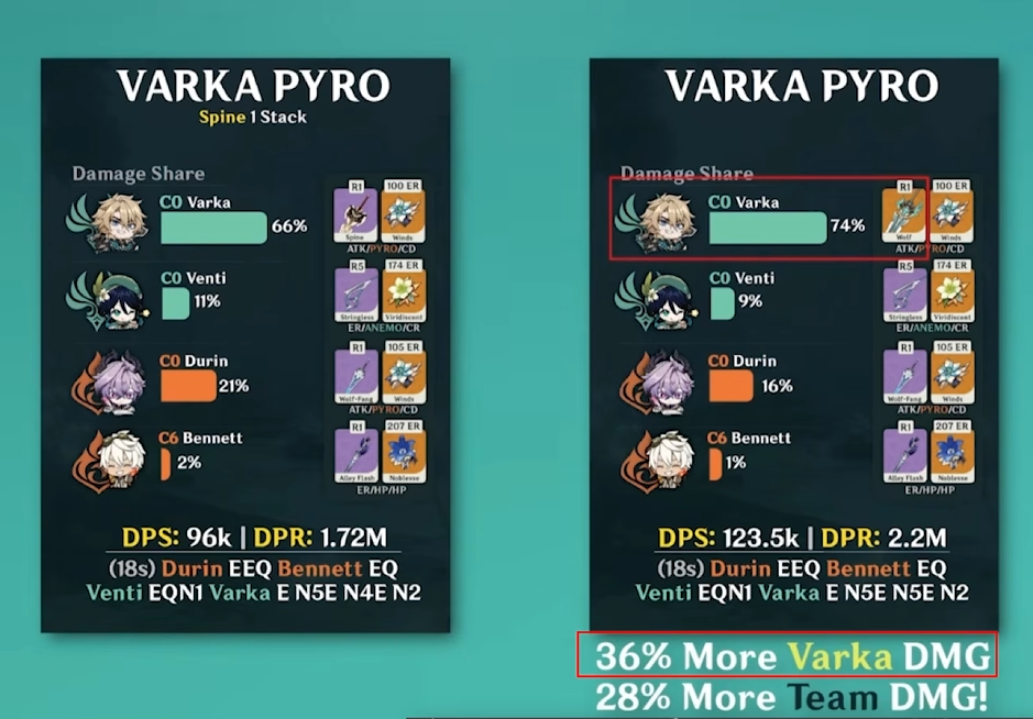 1. Варка в плане пачкостроя очень гибкий чемпик, может играться в 4 разные стихиии. По дамагу скорее драйвер стихий с большей частью стихийного урона, нежели анимешник. То есть для него лучше иметь не анемо кубок, а 4 разных кубка на электро/пиро/крио/гидро под каждую пачку.