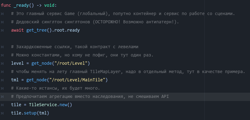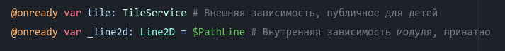 все потомки этой сцены всегда ссылаются на родительский parent.tileMapLayer и parent.astar Как если бы я их явно передал через IoC: child.setup(parent.tileMapLayer, parent.astar)