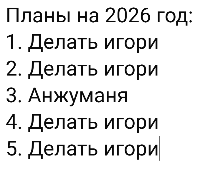 Скоро новый год. Ну а хули мне? А я буду допиливать игру, пока нормальные люди ябутся, бухают, или лампово сидят в кругу друзей. Это мой выбор. Это мой путь. И я счастлив, что провел этот год занимаясь полезным и интересным занятием. С наступающим, годотаны.