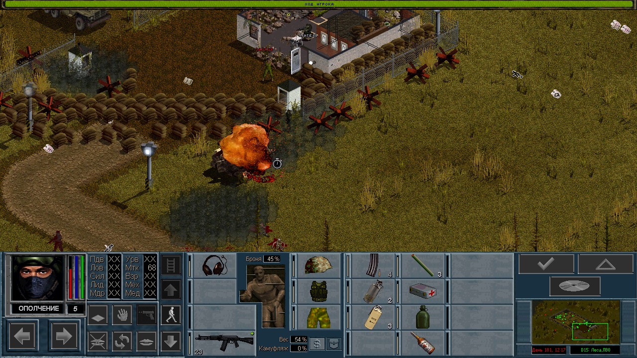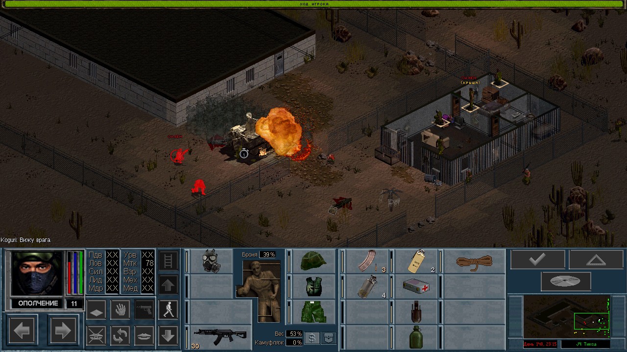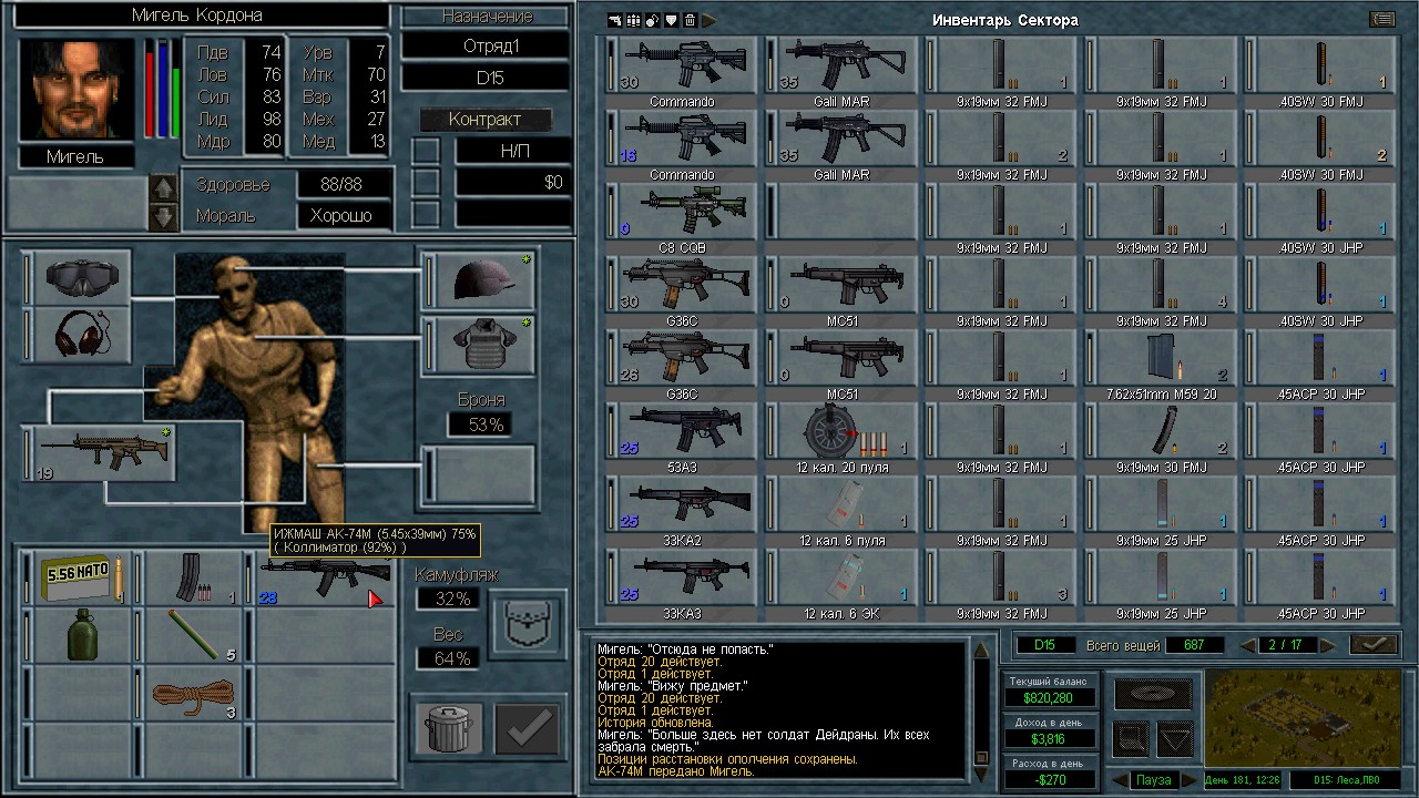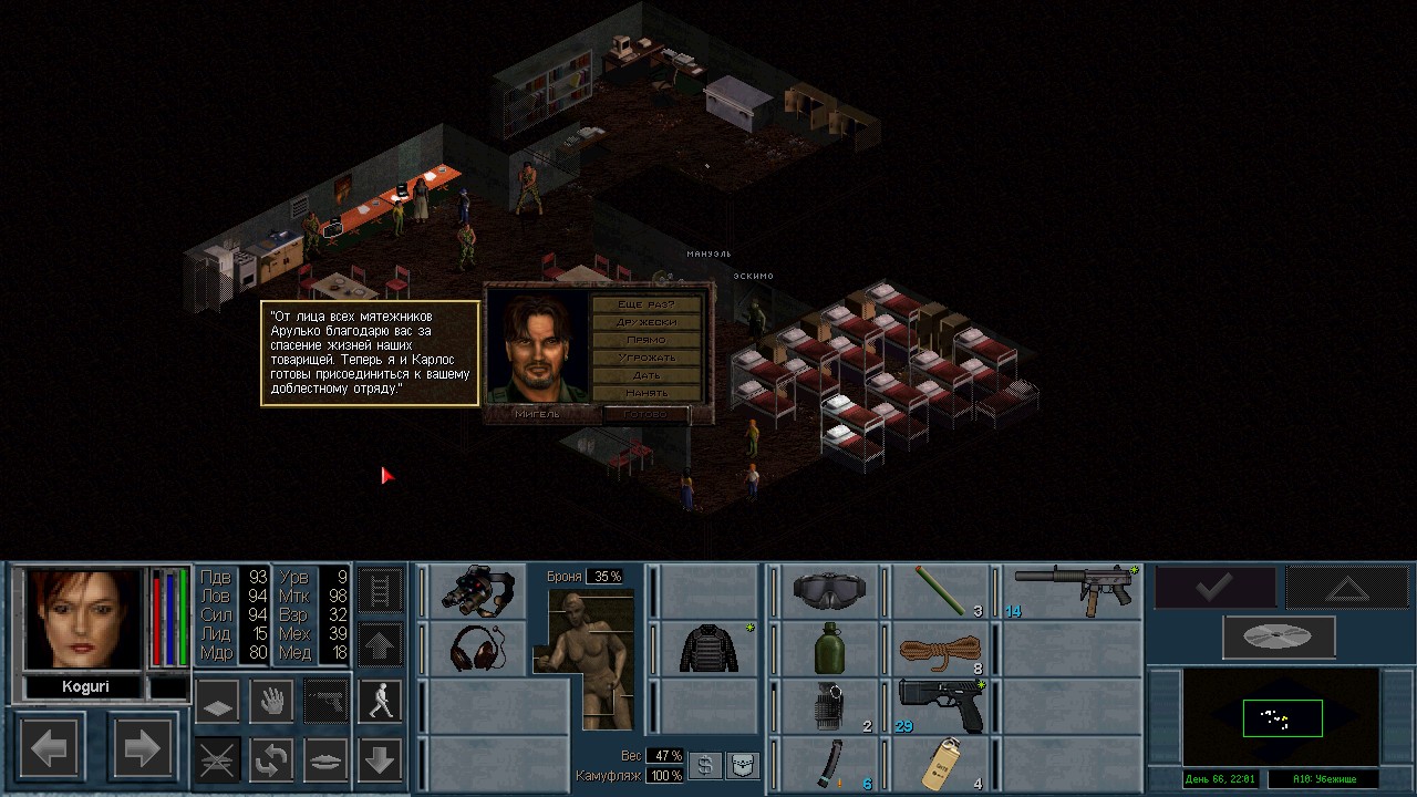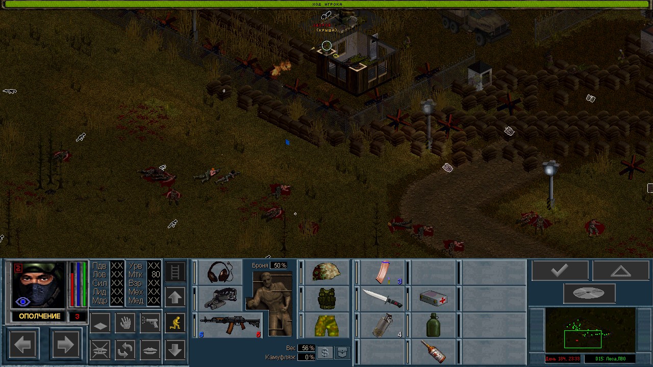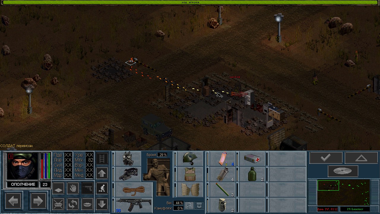 Вот бы какую-нибудь кнопку запрещающую ополчению стрелять. Правда как это сделать я не знаю, скорее всего вообще запретить атаковать. Или на один ход, чтобы они совсем уж беспомощными не были. Вчера напали ночью на ПВО, 28 солдат. Поначалу стреляли, кто куда горазд, потом стрелять начал я, ну и соответственно под конец боя двигать ополчение, менять местами, туда сюда микрить. И вот лежат они такие за мешками, мигают только. Такая лампота, а враги чето там суетятся, бегают. Ничего не могут сделать, потому что тишина. Последних восьмерых застрелили эти два чувака на вышке. Остальные бросали свет и подсвечивали цели. Пока что остается микроконтроль с полной тратой од каждым бойцом на линии огня. В общем тоже вариант, сначало было трудно, теперь нормально. Играть исключительно интересно. Вместо кнопки запретить разговор. Зачем она ополчению А Мигель пару раз выстрелил и бросил 3 хим. осветителя. Сидит там чтобы автобоя не было. Хотя на ПВО его может и не быть, все время забываю проверить.