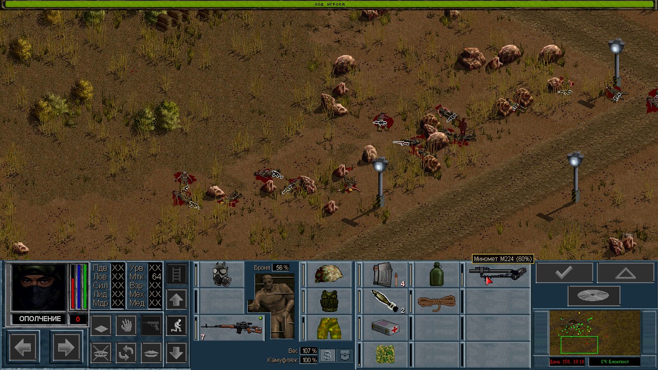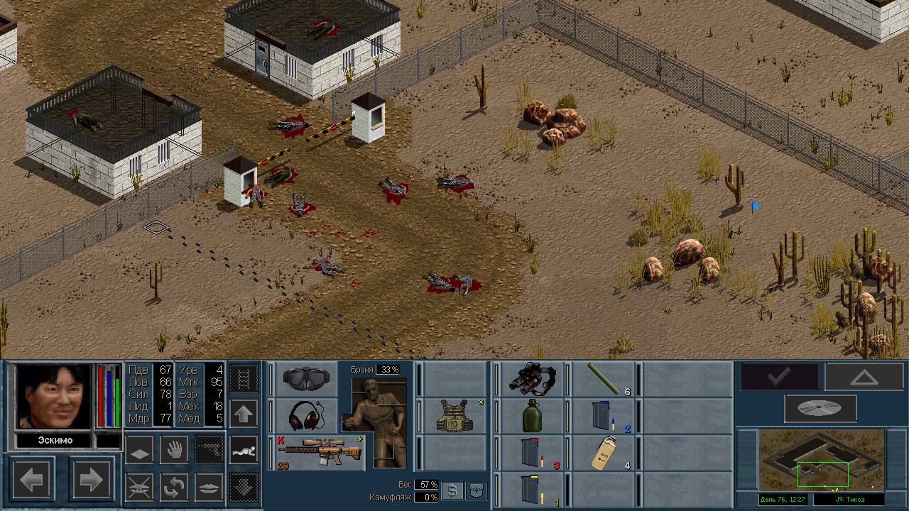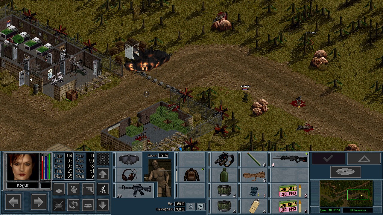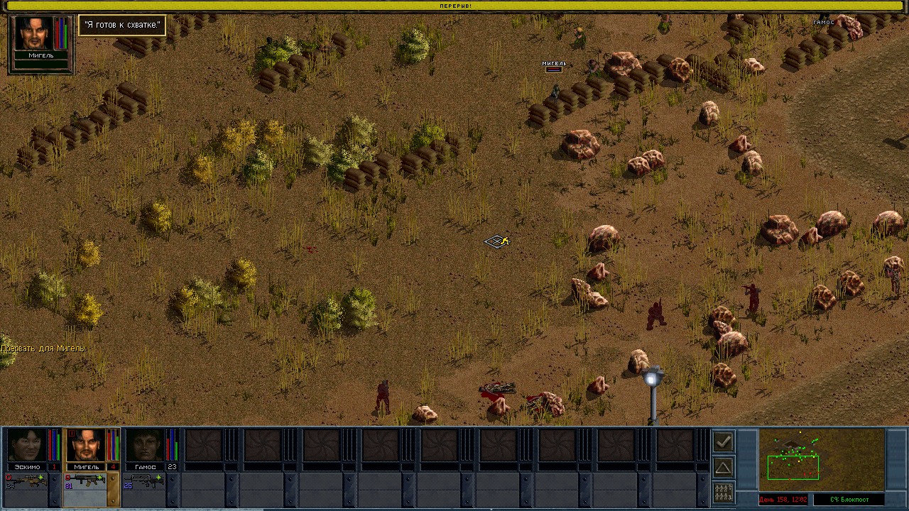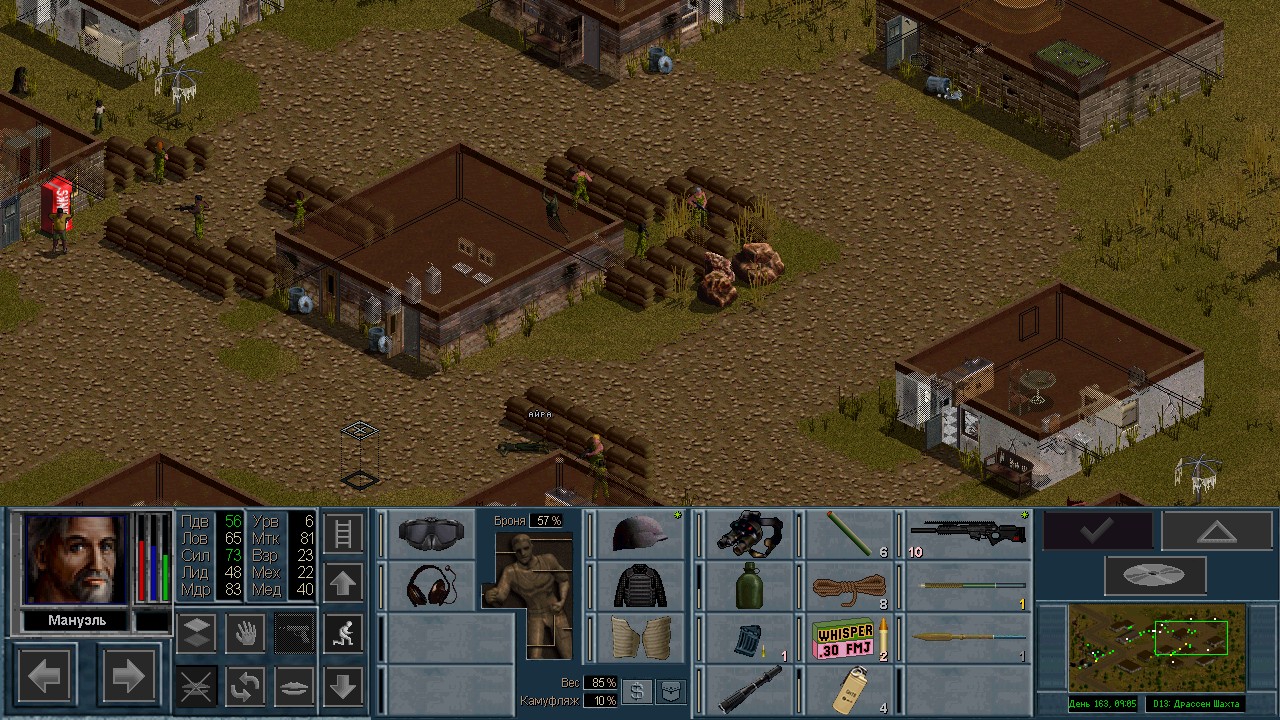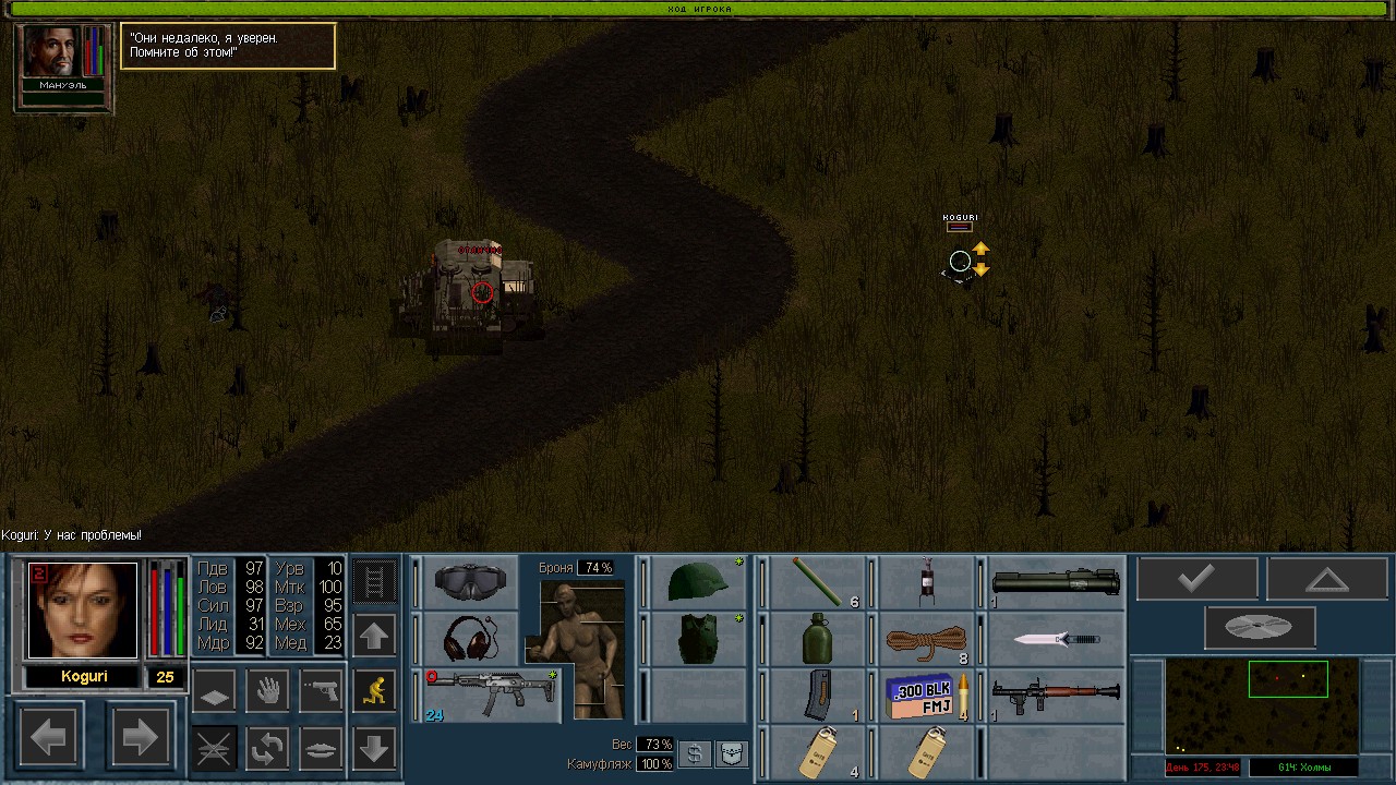 Вот бы какую-нибудь кнопку запрещающую ополчению стрелять. Правда как это сделать я не знаю, скорее всего вообще запретить атаковать. Или на один ход, чтобы они совсем уж беспомощными не были. Вчера напали ночью на ПВО, 28 солдат. Поначалу стреляли, кто куда горазд, потом стрелять начал я, ну и соответственно под конец боя двигать ополчение, менять местами, туда сюда микрить. И вот лежат они такие за мешками, мигают только. Такая лампота, а враги чето там суетятся, бегают. Ничего не могут сделать, потому что тишина. Последних восьмерых застрелили эти два чувака на вышке. Остальные бросали свет и подсвечивали цели. Пока что остается микроконтроль с полной тратой од каждым бойцом на линии огня. В общем тоже вариант, сначало было трудно, теперь нормально. Играть исключительно интересно. Вместо кнопки запретить разговор. Зачем она ополчению А Мигель пару раз выстрелил и бросил 3 хим. осветителя. Сидит там чтобы автобоя не было. Хотя на ПВО его может и не быть, все время забываю проверить.