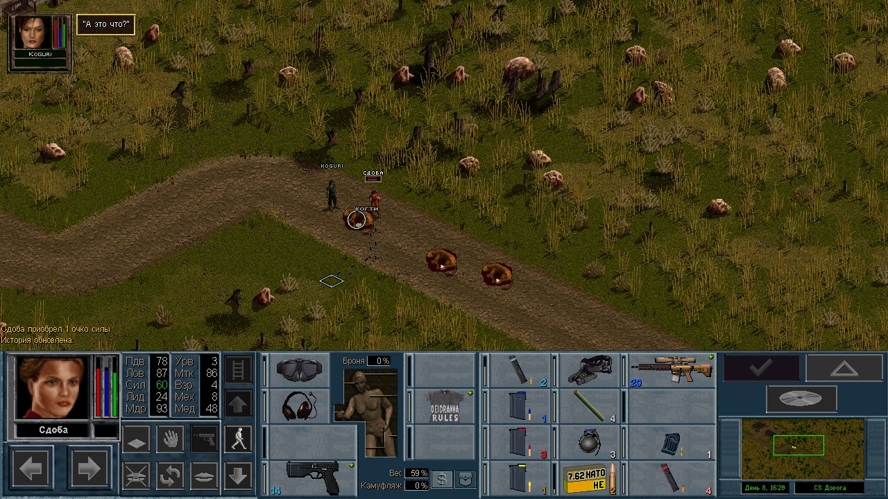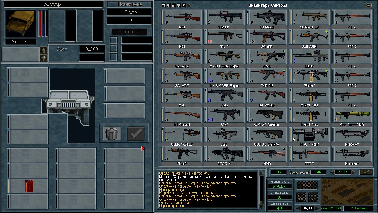 17/17 прогресс, когда только успели? Вчера сделал еще один круг по Арулько блокпост Балайм- Эстони- блокпост у Камбрии- Сан Мона Починили робота. За час 4 хп чинится. В конце просто ЗАЛЕТЕЛИ НА ХАММЕРЕ в сектор с 28 врагами. Шенк умудрился сесть обратно в авто под огнем противника и "уехать", но полосочка хп зримо присутствовала на месте Хаммера и все враги агрились на него. Кто-то бросил ему слеповуху под Хаммер. Высадил его в тактике и он зареспавнился где-то далеко в противоположном конце на востоке в кукурузе с громким АААХХХХ... Потом держали с роботом круговую оборону. У бедолаг постоянно клинило оружие, они не могли попасть, а на последок полоска с именем Шенка уехала ~вжжжжжжжжж~ прям посреди хода противника слева направо. Хаммер на месте. Ололо давно я так не веселился