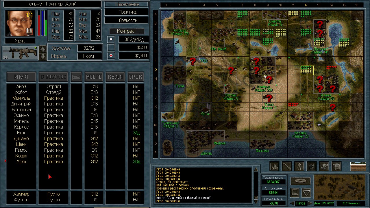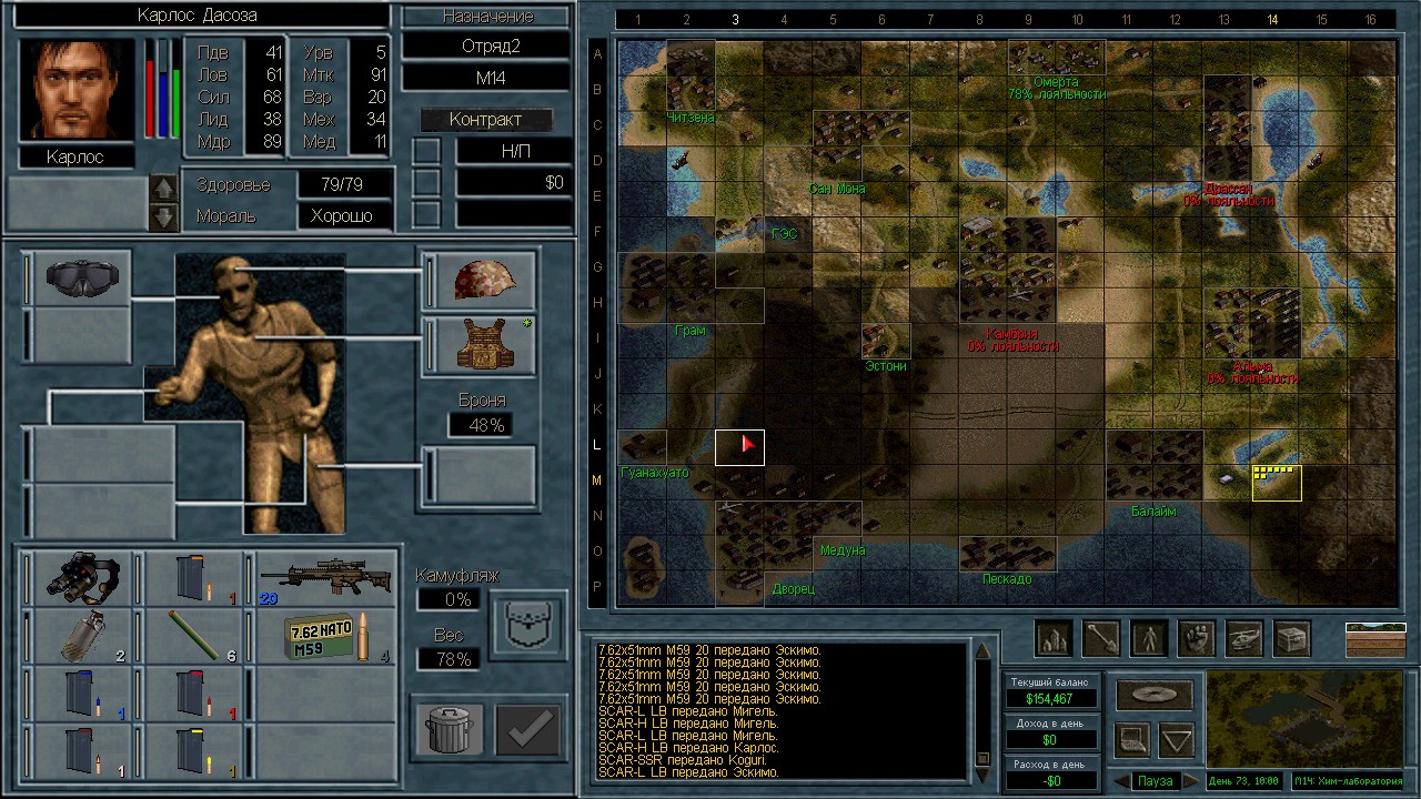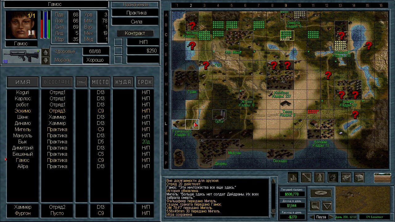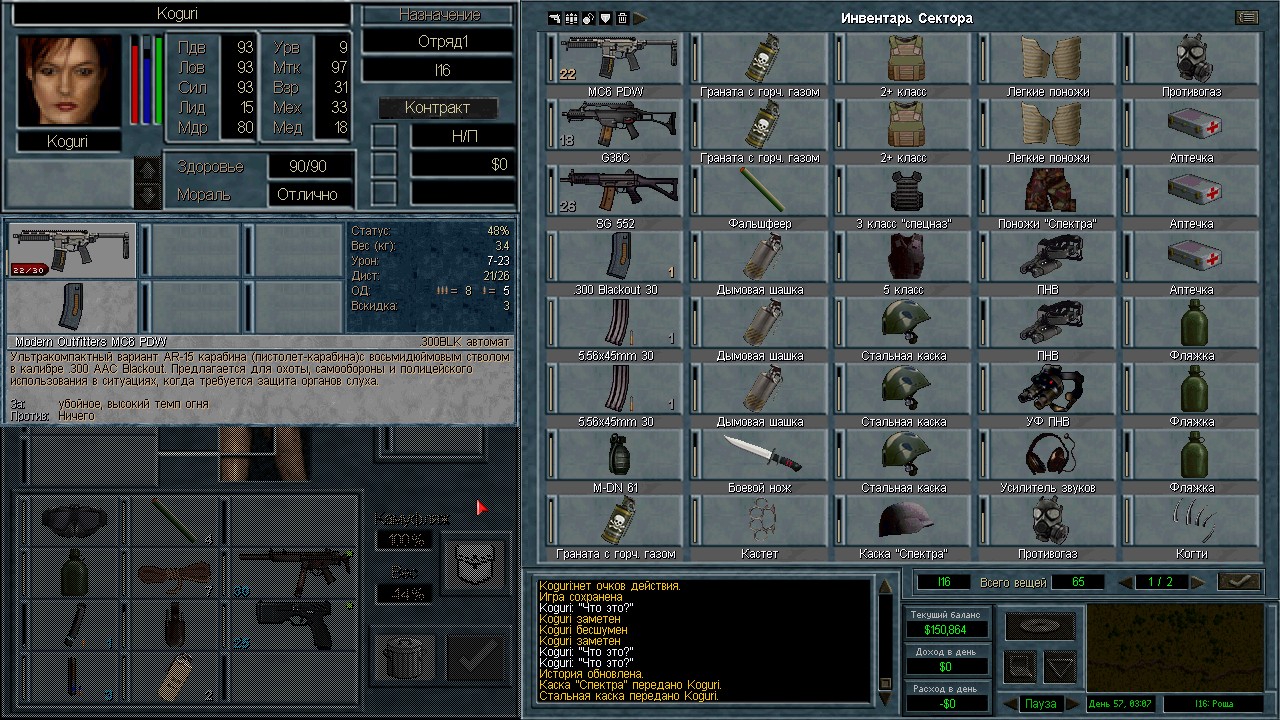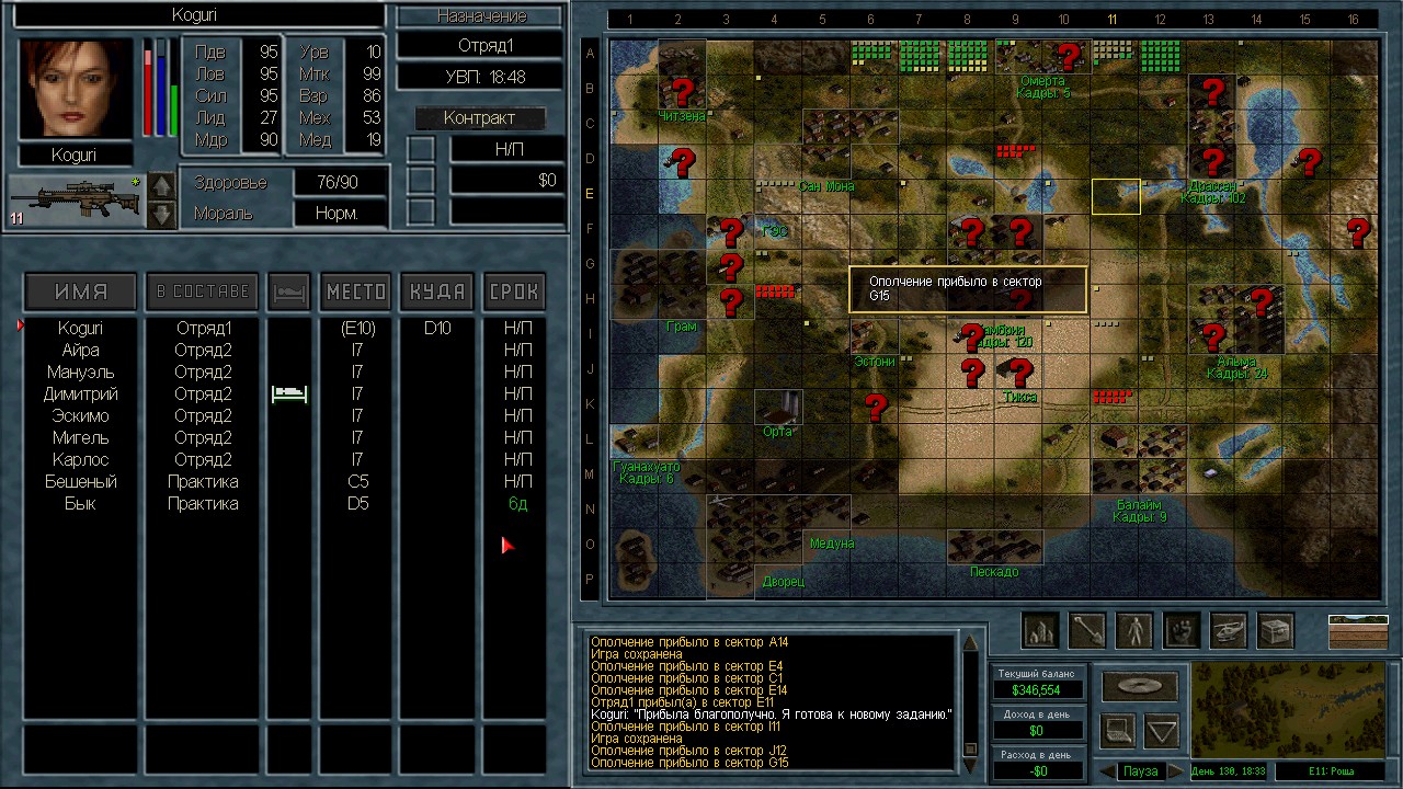 Лучшими людьми оказались 13 солдат с мп5/40, они вышли из Камбрии и были перехвачены в пустыне. Я специально оставил 3-х чтобы посмотреть куда они пойдут. Пошли на ПВО. ИИ пытается атаковать с разных сторон. Это радует конечно, но ему не хватает мощности. На северный блокпост вышел отряд 18 человек аж из Грамма. Через Сан-Мону с запада на восток. Переложил мешки в соответствии с тактическими нуждами и в результате 12 элитных ополченцев в новом отряде.