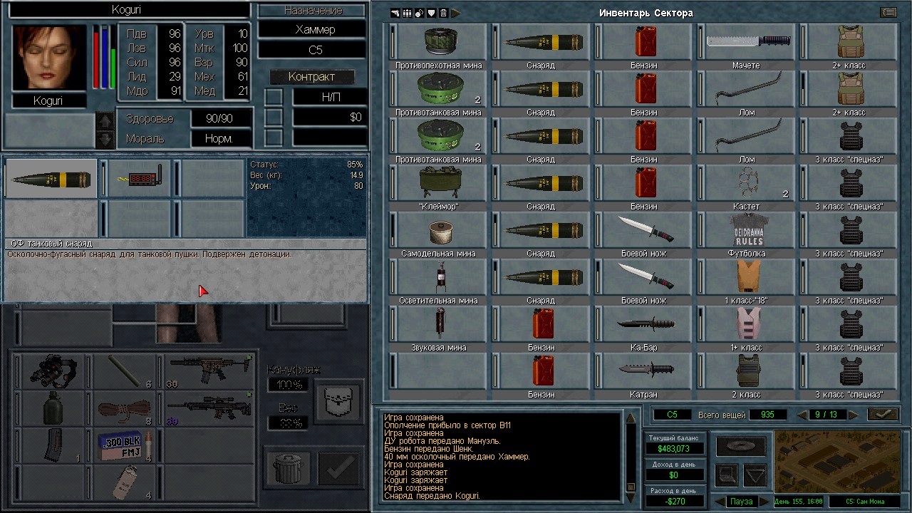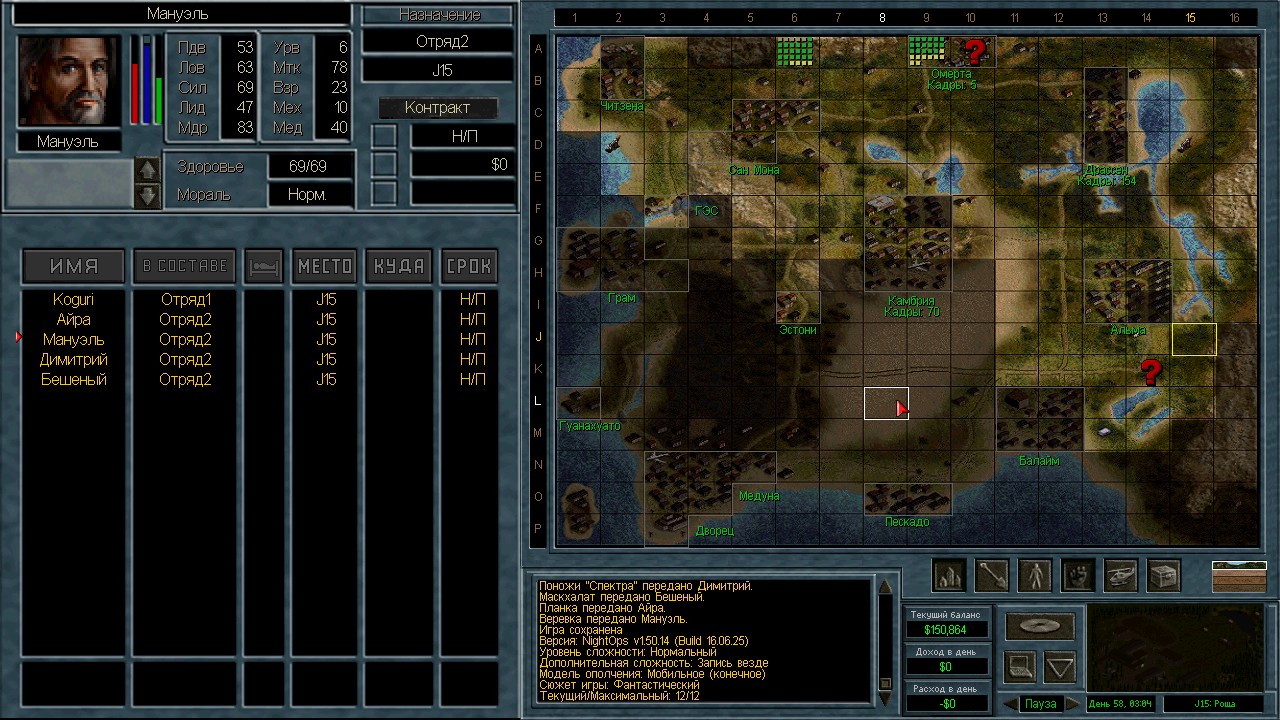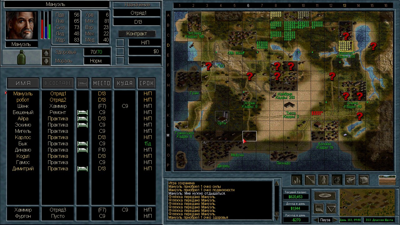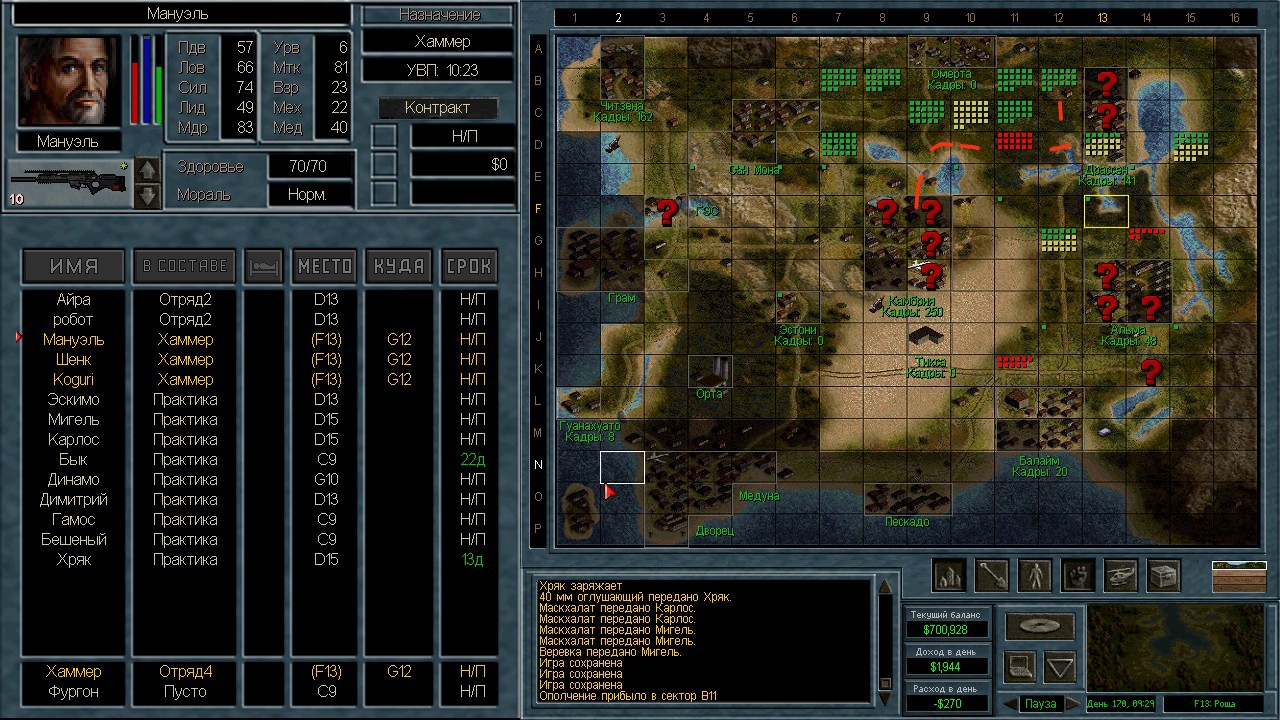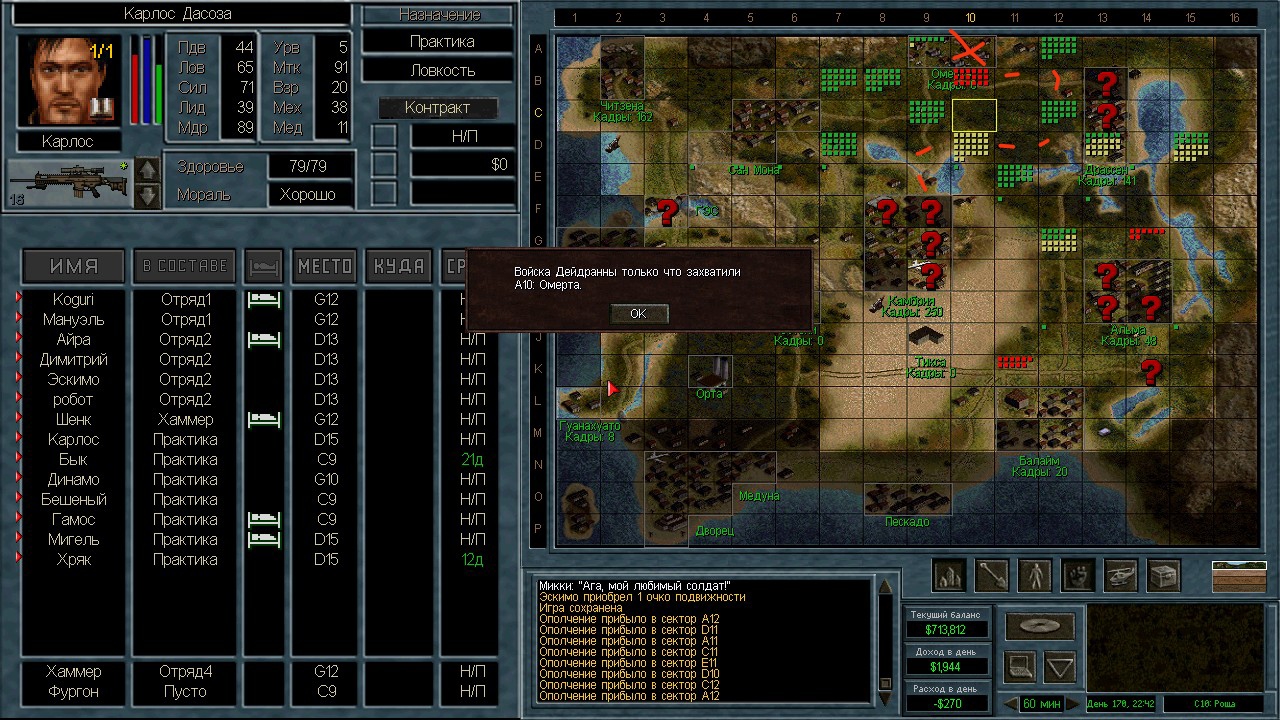 Лучшими людьми оказались 13 солдат с мп5/40, они вышли из Камбрии и были перехвачены в пустыне. Я специально оставил 3-х чтобы посмотреть куда они пойдут. Пошли на ПВО. ИИ пытается атаковать с разных сторон. Это радует конечно, но ему не хватает мощности. На северный блокпост вышел отряд 18 человек аж из Грамма. Через Сан-Мону с запада на восток. Переложил мешки в соответствии с тактическими нуждами и в результате 12 элитных ополченцев в новом отряде.