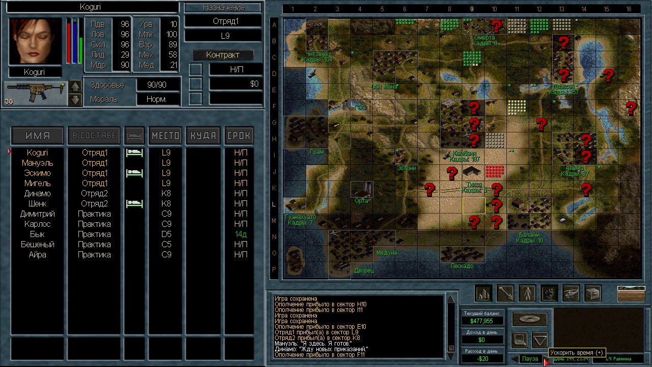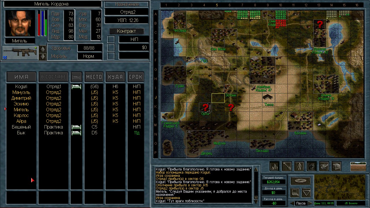 В ближайших планах заблокировать Камбрию с севера и востока желтенькими вперемешку с зелеными. Чтобы прокачать как можно больше ополчения (около Камбрии это очень удобно) И затем забрать Альму. Два сектора Альмы под вражеским ПВО, но в результате таких действий высвобождаются наемники, и даже, наверное ополчение. Остается открытый юг.