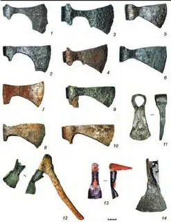 Сохранилось множество фрагментов топоров, которые явно не были похожи на хозяйственные, а значит создавались с одной целью - войны. Топор был намного проще меча в производстве, его мог любой кузнец отлить, древко в случае чего менялось, точить было проще, обучаться проще, при ссуженом основании топорища и широком лезвии им можно было зацеплять за доспех как клевцом. О чем речь вообще, шизы?