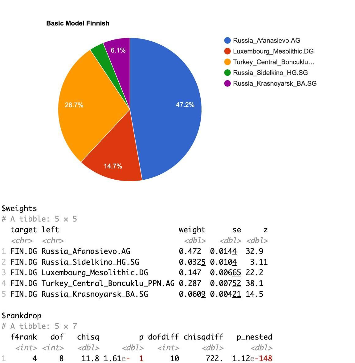 Лучше всего воспользоваться академическим инструментом ADMIXTOOLS. ADMIXTOOLS — набор программ на основе расчёта f-статистик (сравнения аллельных частот), который показывает, как смешивались разные популяции, и позволяет оценить, из каких «источников» (Ref-популяций) сложилась целевая (Target) популяция. ADMIXTOOLS 2 – более новая и быстрая версия, реализованная на языке R. ADMIXTOOLS - https://github.com/DReichLab/AdmixTools ADMIXTOOLS 2 - https://github.com/uqrmaie1/admixtools