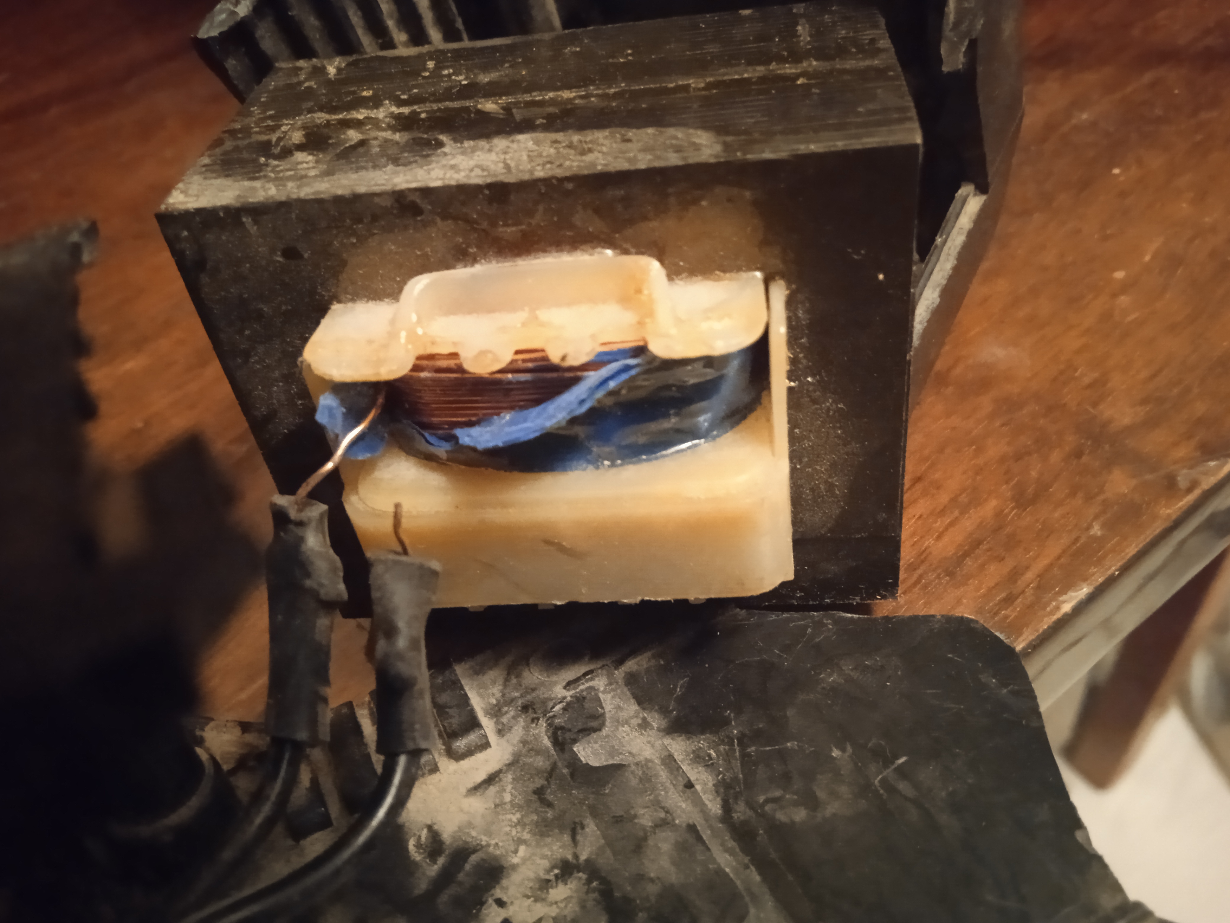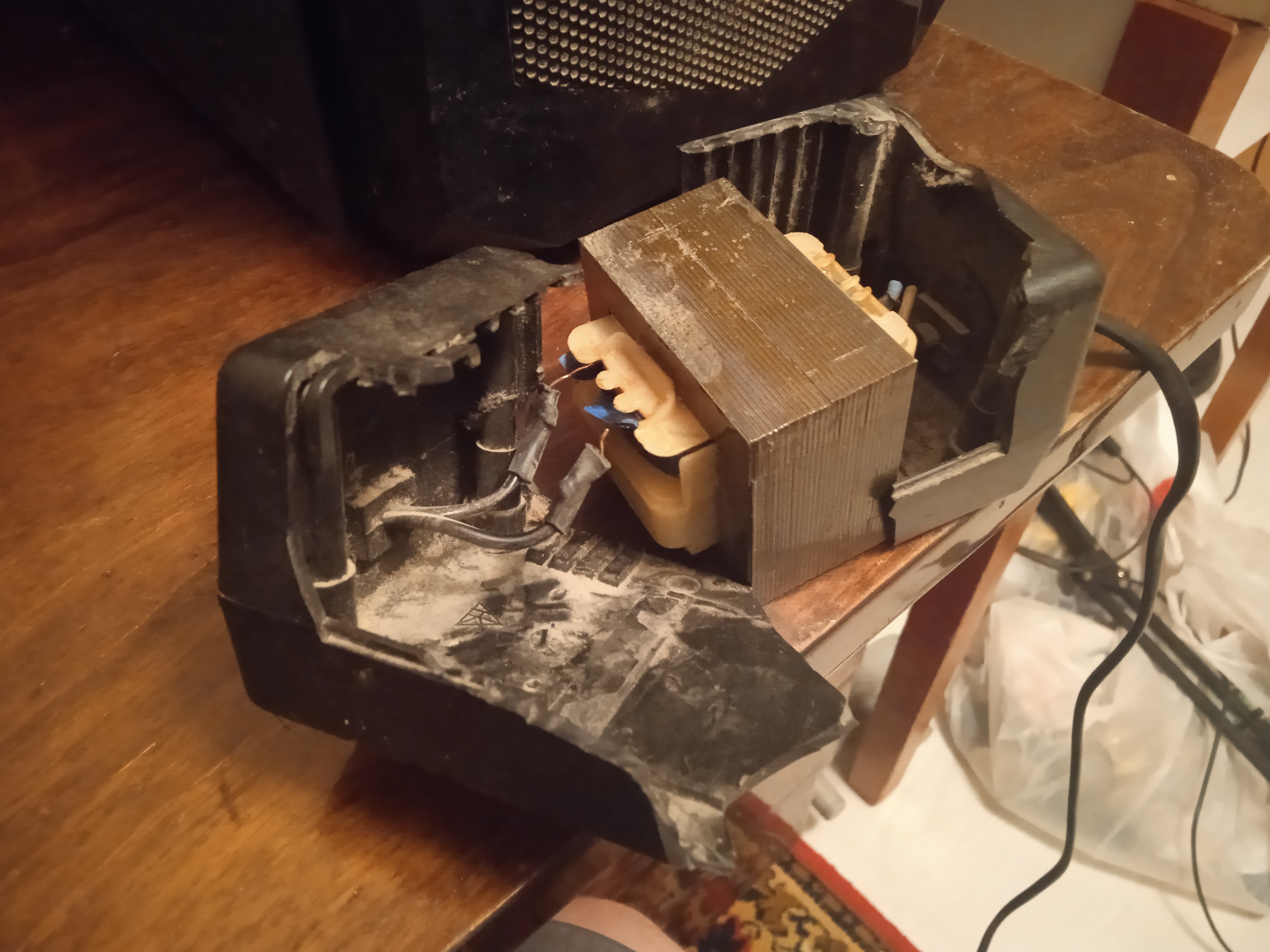 Анон, выручай! Вот уже около 20 лет колоночки J-707 от Jazz Hipster радовали меня отменным хрипящим звуком. Но сегодня после ремонта комнаты я возвращал вещи на свои законные места и был неприятно удивлён, звука больше нет. Очевидно, что проблема в этой коробке на кабеле питания, которую я впервые уронил лет 10 назад и с тех пор ронял ещё много раз. Я так понимаю это какой-то трансформатор, но какой? Возможно ли сейчас купить такой же или лучше отнести этот в ремонт? Я сфотографировал внутренности и видно. что с одной стороне к катушке идёт лишь один провод и я понятия не имею как подсоденить второй, если проблема вообще в нём.