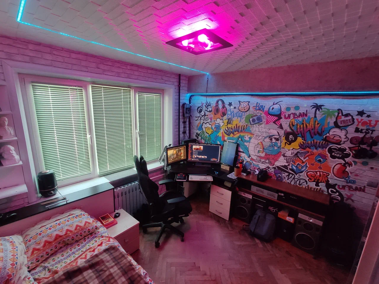 >>7486780 Блять, вот это выглядит в сто раз лучше, чем кофейня-коморка у анона с листьями. Может чуть менее уютно, но чувствуется, что в этой комнате кипит жизнь и хоть царит беспорядок, но создается ощущение не хаоса, появившегося самого по себе, в результате свинства хозяина, а осознанного создания подобной обстановки, и это выдает построенная пивная стена и повешенные кабеля на стенах, а еще шапка деда мороза на стуле :3. Такие вещи сами по себе не образуются, а требуют целенаправленных усилий. Окно в виде проектора - охуенная задумка и вписывается в общую похуистично-утилитарную эстетику.