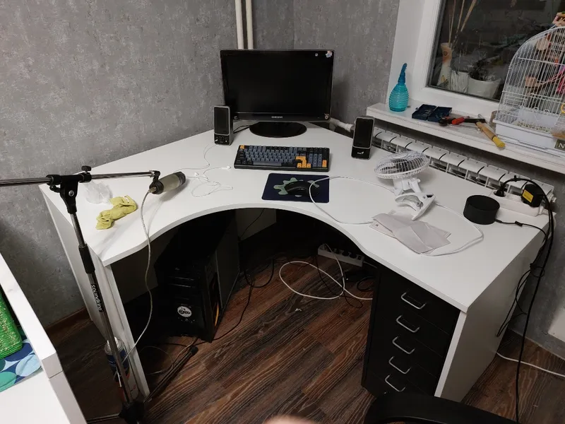 >>7486101 Стол выглядит неплохо, я бы от такого не отказался. В остальном, конечно, печально и по валяющимся проводам, и по "подставкам" для маняторов вместо кронштейнов.