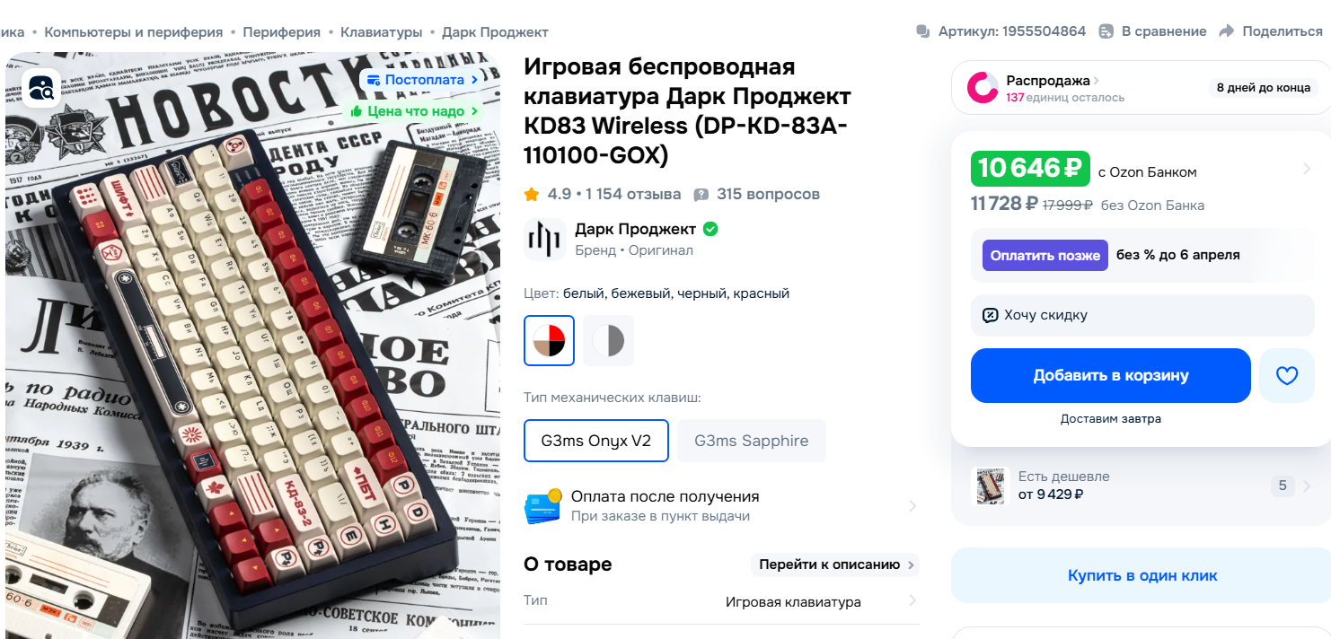 >>7629611 Я когда не шарил, а имеющаяся клава еле нажималась, сдуру заказал кейрокс (да), попользовался 5 минут, чуть не проблевался с этой погремушки, там еще местами не очень аккуратно коробку открыл, ну да ладно. И тоже приняли возврат спокойно. Про свитчи тоже обязательно блять под каждыми пишут отзывы, что не подходит на какую-то говноклаву без хотсвапа, ряя товар говно. Про кепки вообще молчу, в 99,9999% случаев придет подделка на какие-то кепки, которая полностью просвечивает (никаким двухслойным пбт там и не пахнет), буквы криво нанесены, сами кепки коряво отлиты, вот это всё