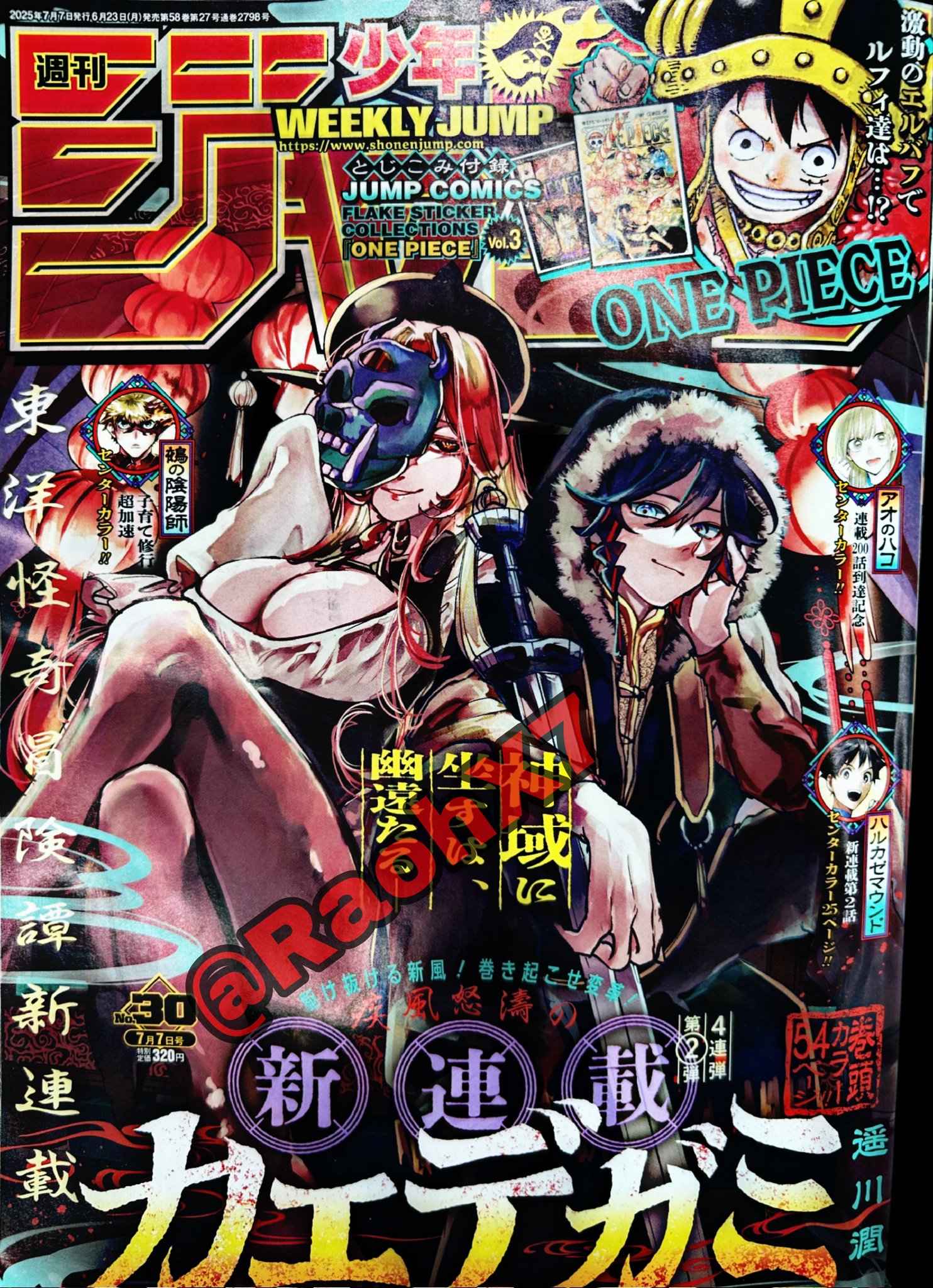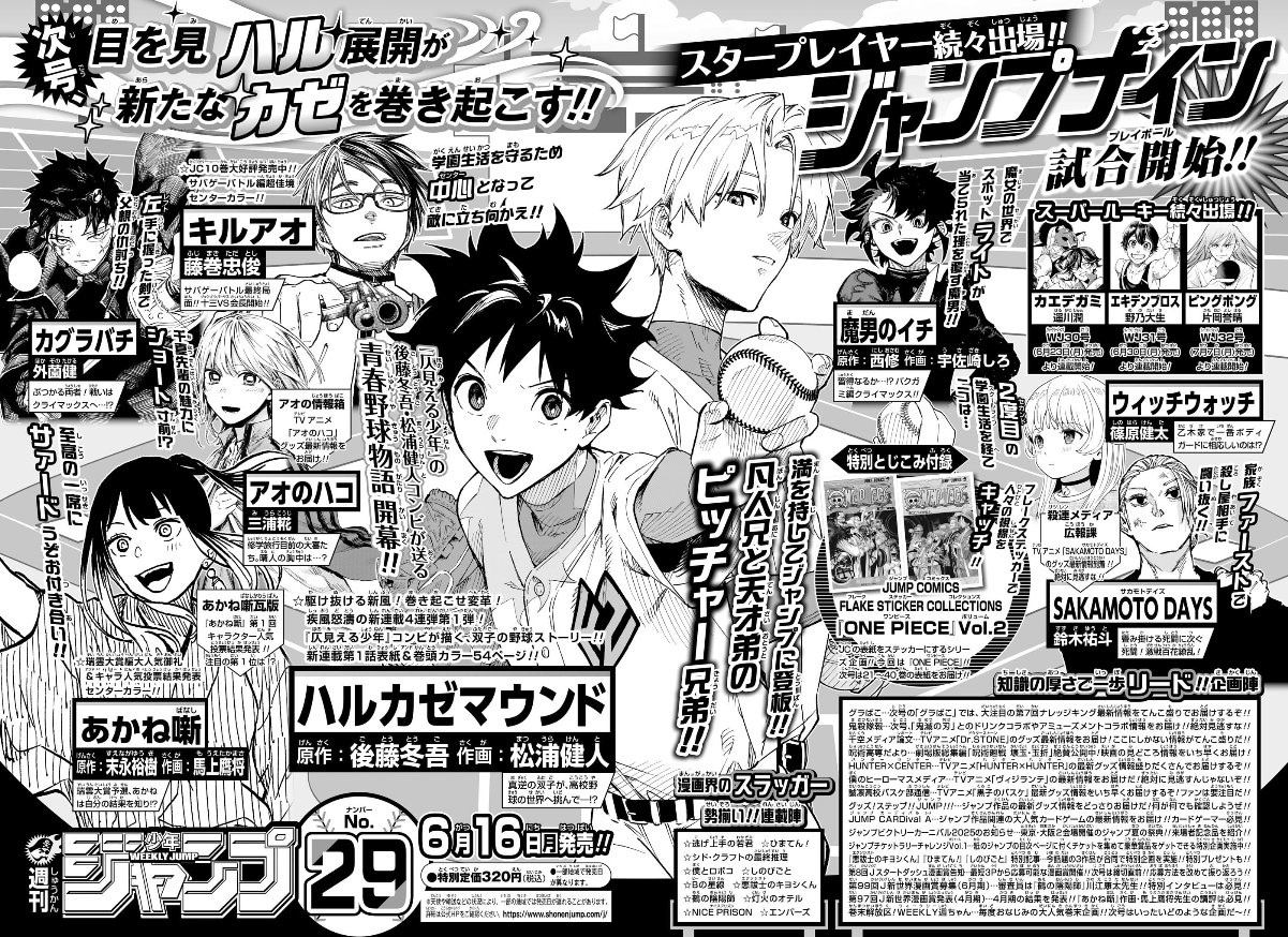 Weekly Shonen Jump Issue #31 (2025) Ekiden Bros (Cover & Lead Color Pages; 54p; New Series by Nono Daiki) Kagurabachi ONE PIECE Blue Box Me & Roboco Kaedegami (Color Page; Second Chapter) WITCH WATCH SAKAMOTO DAYS Ichi the Witch (Color Page) Harukaze Mound Otr of the Flame (First Ranking) Ultimate Exorcist Kiyoshi Akane-banashi Shinobi Undercover The Elusive Samurai (Color Page) Nue's Exorcist NICE PRISON Hima-Ten! Kill Blue Star of Beethoven (End of Serialization)