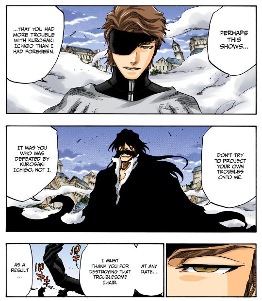 У Айзена по сути незакрытая арка. Он сейчас подошёл к дзену со своими мыслями об Ичиго, но чтобы целиком решить свою дилемму ему нужно ещё и новую цель найти. Так что со сценарной точки зрения доставать его точно имеет смысл.