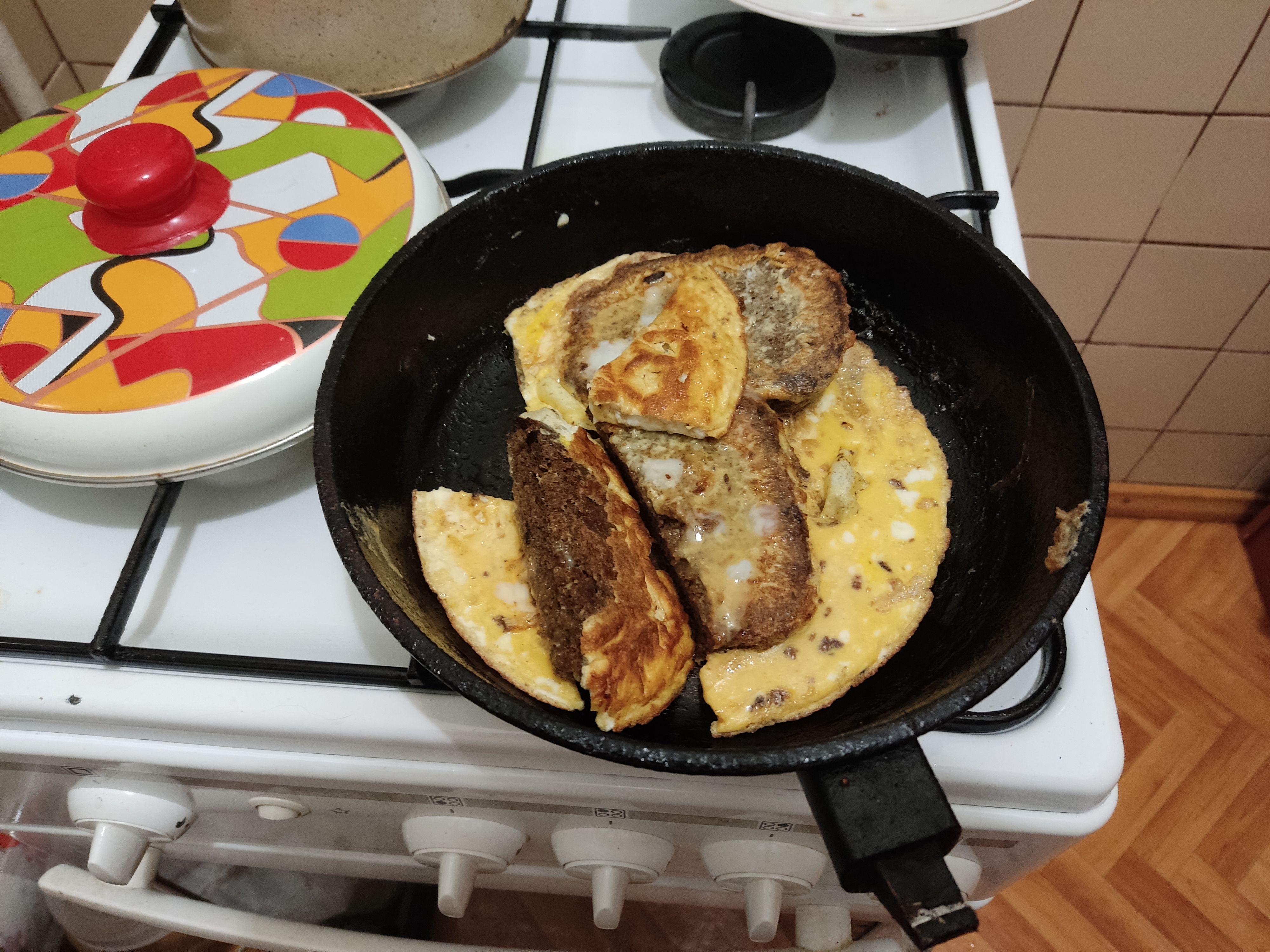 >Хотите яиц с хлебом? Бородинский-черногорский Хотел что-то такое сделать, только без яиц, чисто бородинский хлеб с чесноком пожарить, типа гренки к пиву. Но уже делаю раменчик. Почти всё готово, только бульону осталось докипеть и вытянуть весь вкус из костей.