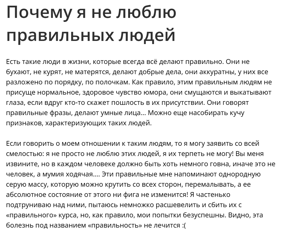 >>4442543 > Ведёшь себя правильно: ты плохой. > Ведёшь себя неправильно: как ты посмел, сейчас мы тебя уничтожим. Ну да ладно. Это был мой бугурт. А теперь про картинку с текстом.