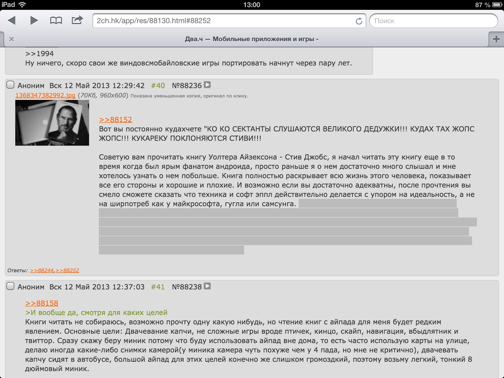 Купил я себе очень замечательный планшет среди ведроид аппаратов под названием Huawei mediapad, экран 1280x800 ips, алюминевый корпус, процессор джва ядра, озу 1гб, последний андроид 4.0.3, что еще нужно для счастья? Ценник в 12500 рублей. Купил и поначалу не мог нарадоваться. Целый день восторгался "плавностью", кучей кучей приложений, приятным на ощупь корпусом, каштомизировал рабочие столы. Но и тут через некоторое время проявились проблемы: экран не давал нормального черного цвета несмотря на ips матрицу, этот же экран не имел ни малейшего намека на олеофобное покрытие и быстро пачкался, а батарейка так вообще тонула за 3-4 часа интернета через 3g, десятки игр накаченных с четырепэдэа я запускал только дома вблизи розетки, а камера шумное говно. Ну оставим железо на совести китайцев, поговорим об андроиде, плавность была не такой уж и плавной, маркет убогое говно, лаги баги вылеты. Но не сказать что я собирался переходить на айос, я думал что это все такая же убогая ограниченная система. Пока однажды не зашел случайно в мвидео где мне в руки попался айпад, вы знаете. Мне хватило двух минут подержать его в руках чтобы моя ведроидеология дала слабину, я слегка шокированный ушел домой и там почитал подробные ттх и посмотрел обзоры, я был в восторге, такая та плавность, такая то анимация, такие то одинаковые по форме и красивые иконки, такая-то батарея на 10 часов работы минимум, такой-то эппстор. Что казалось швабодки и каштомизации, они нинужны, всякие виджеты нинужны, а зачем если я могу запустить полноценное приложение пока ведроюзер будет трахаться с маленьким виджетом, зачем швабодка если закрытая система более удобна для простого юзера. Айос выполняет любые действия абсолютно идеально, для серфинга, игр, творчества, айос подходит просто идеально, андроид нужен тем кто в детстве не наигрался в конструктор, только в случае андроида это очень некачественный китайский конструктор из деталек неправильной формы и самого токсичного пластика. Переходи на айос и гарантирую ты не соснешь, а будешь восторгаться и поймешь насколько андроид ущербный. Добра