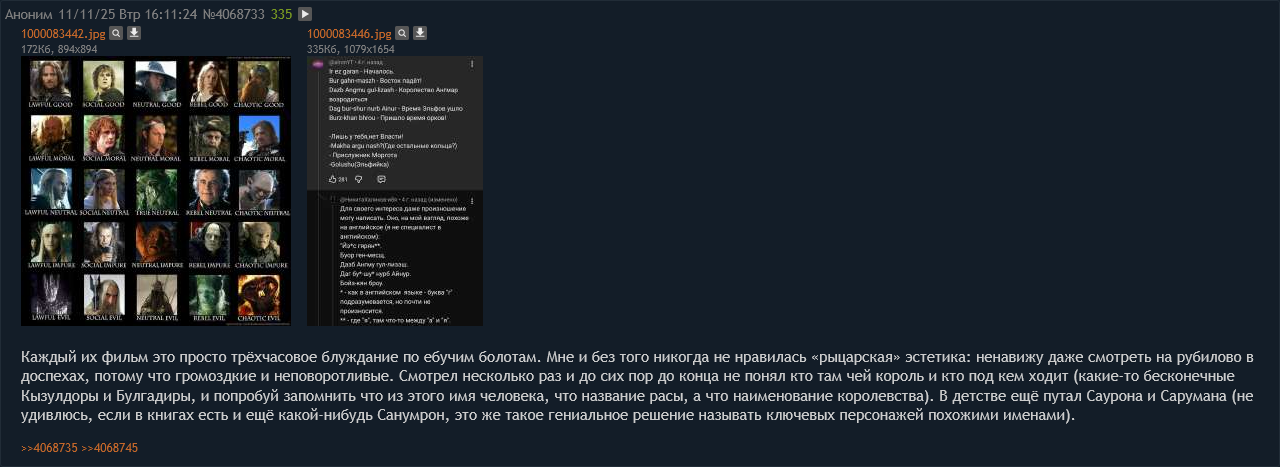 Каждый их фильм это просто трёхчасовое блуждание по ебучим болотам. Мне и без того никогда не нравилась «рыцарская» эстетика: ненавижу даже смотреть на рубилово в доспехах, потому что громоздкие и неповоротливые. Смотрел несколько раз и до сих пор до конца не понял кто там чей король и кто под кем ходит (какие-то бесконечные Кызулдоры и Булгадиры, и попробуй запомнить что из этого имя человека, что название расы, а что наименование королевства). В детстве ещё путал Саурона и Сарумана (не удивлюсь, если в книгах есть и ещё какой-нибудь Санумрон, это же такое гениальное решение называть ключевых персонажей похожими именами).