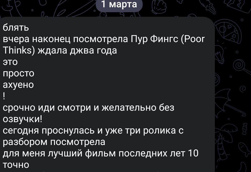 >>4074060 Ну смотри, у меня у самого относительно высокая оценка у Poor Things стоит. По наполнению фильм хуйня, но: