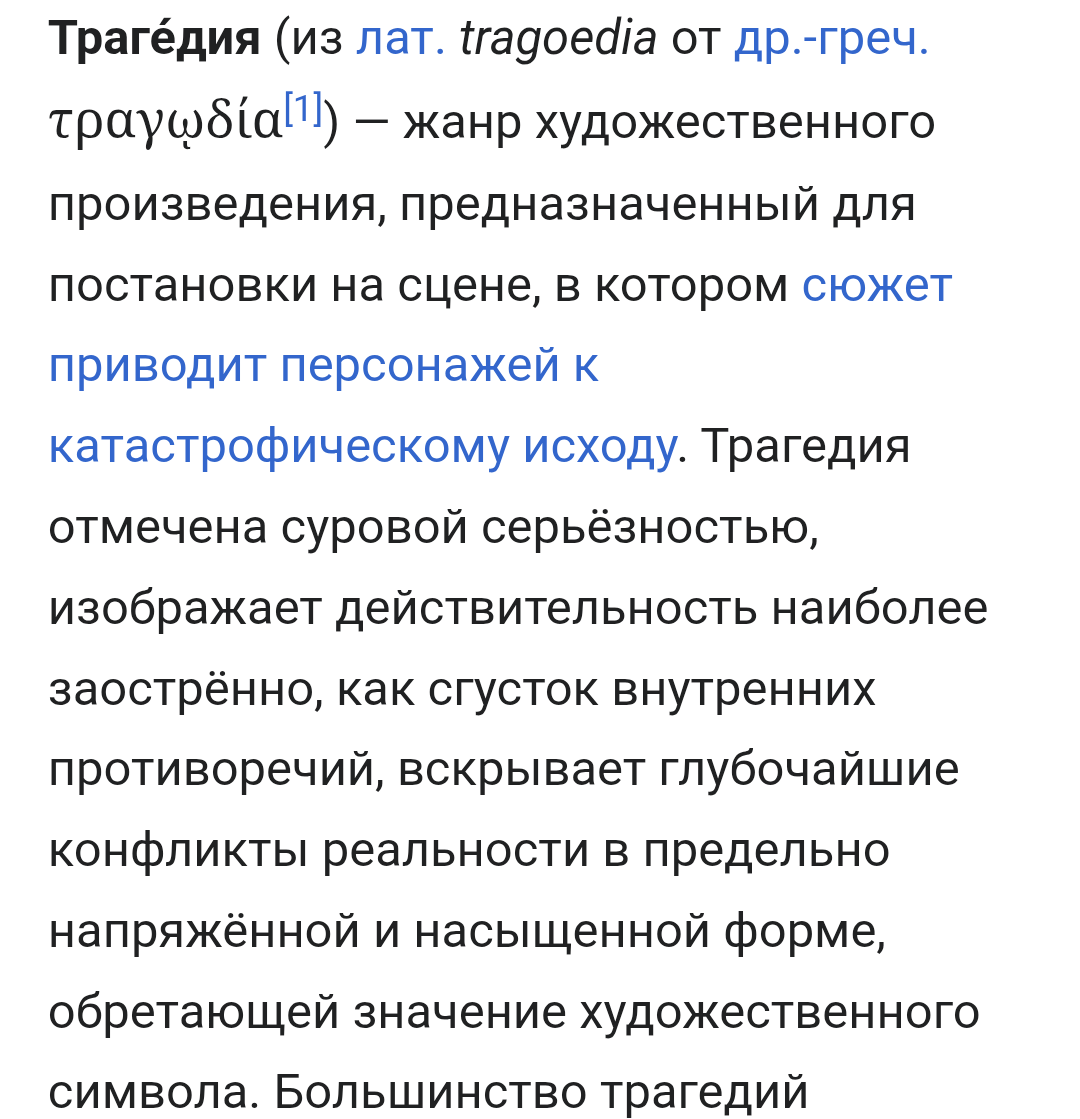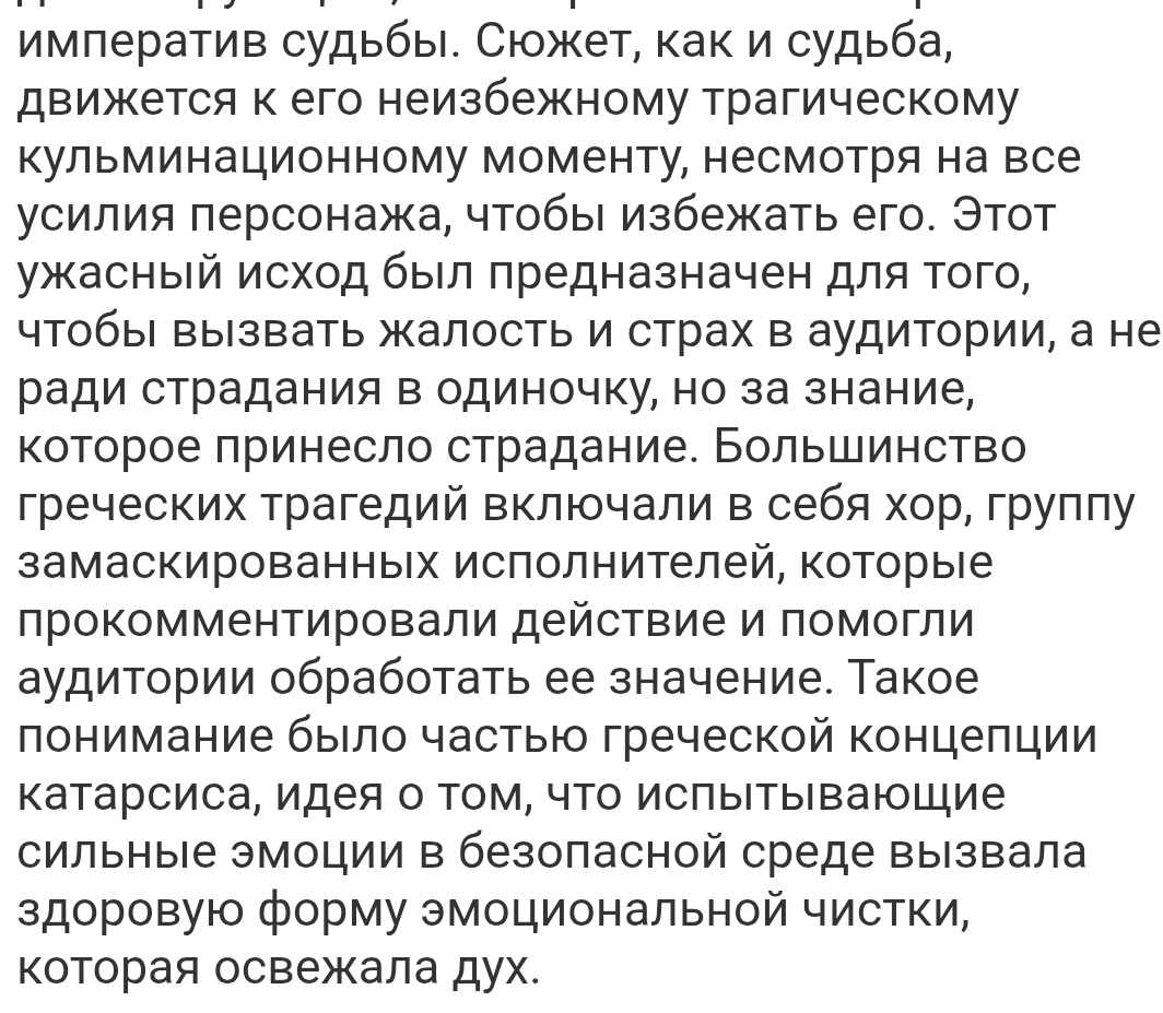 >>4074285 > Древнегреческие трагедии это базис западной драматургии > предают греческую традицию в главном - дают зрителям надежду. Но ведь греческая трагедия надежды не даёт. Греческие трагедии заканчиваются плохо. Трагедия это буквально спойлер, что все будет хуево. Ни про какую надежду там нет.